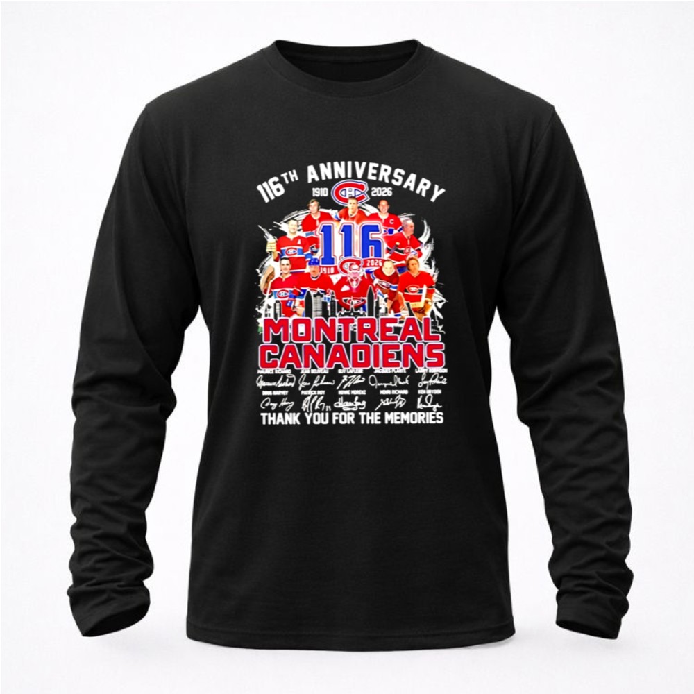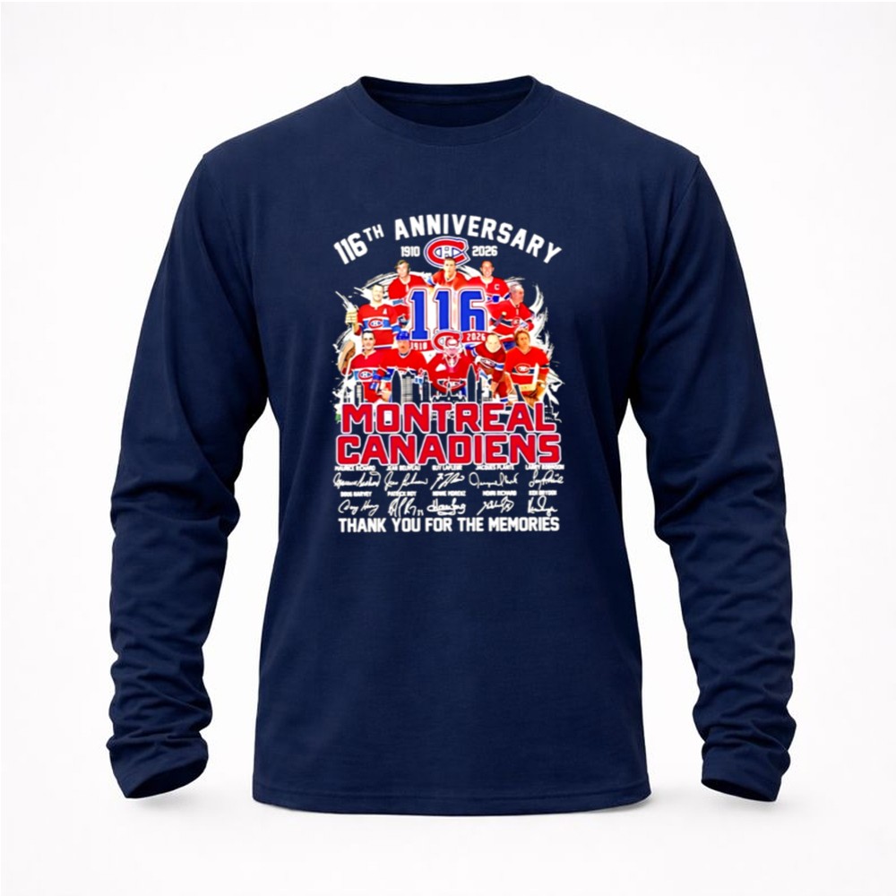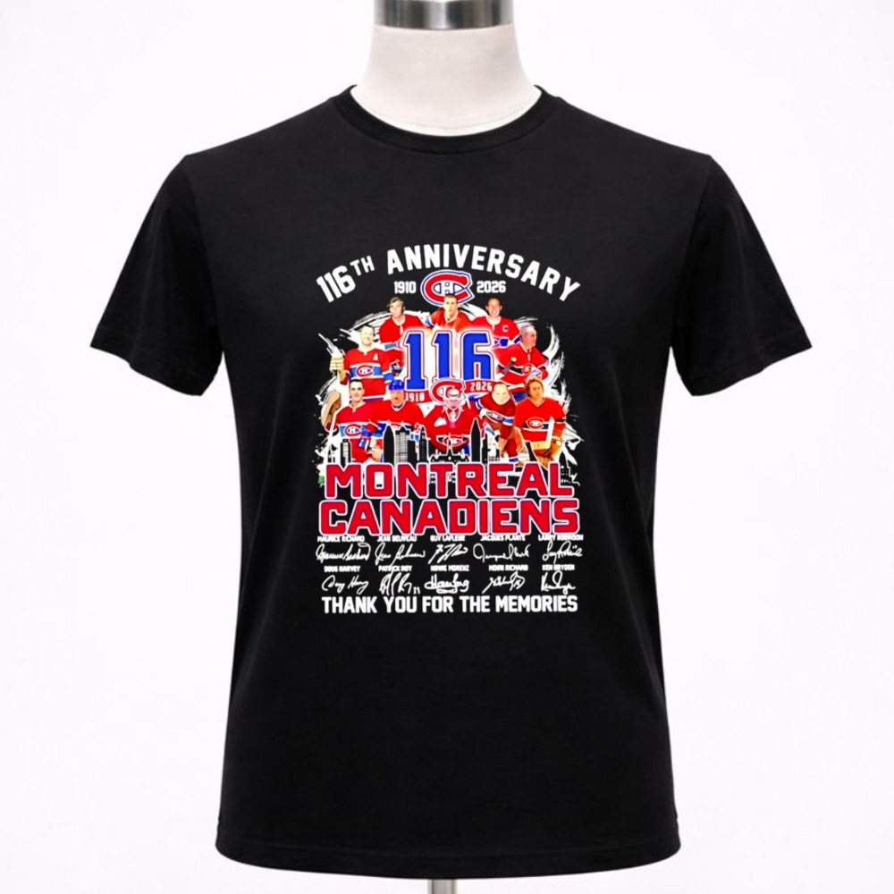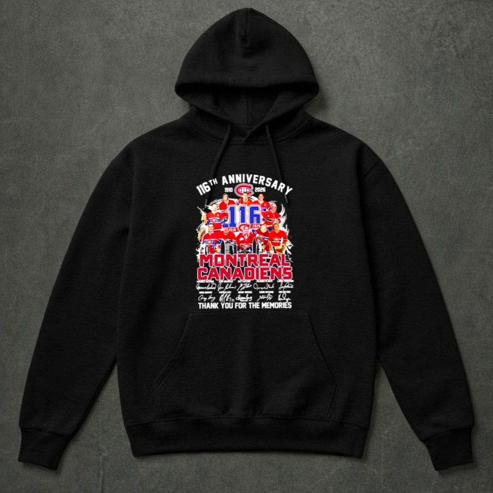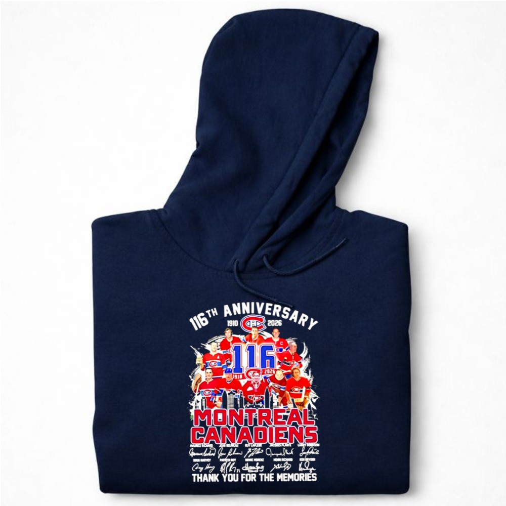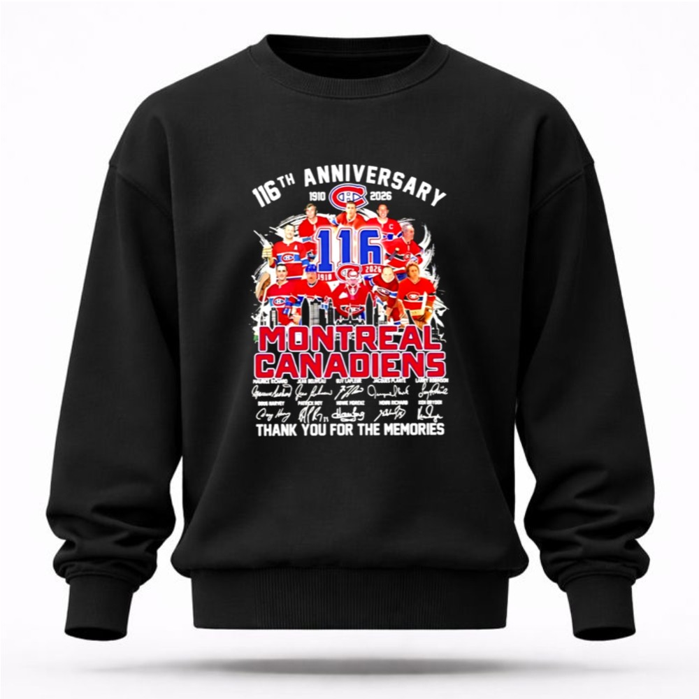 This design serves as a heartfelt tribute to the Montreal Canadiens, celebrating 116 years of hockey history and the unity among fans. With a bold graphic showcasing multi-player signatures, it embodies the spirit of triumph and nostalgia that resonates within the iconic Bell Centre. Each detail reflects gratitude for the unforgettable memories shared by generations of Canadiens supporters.