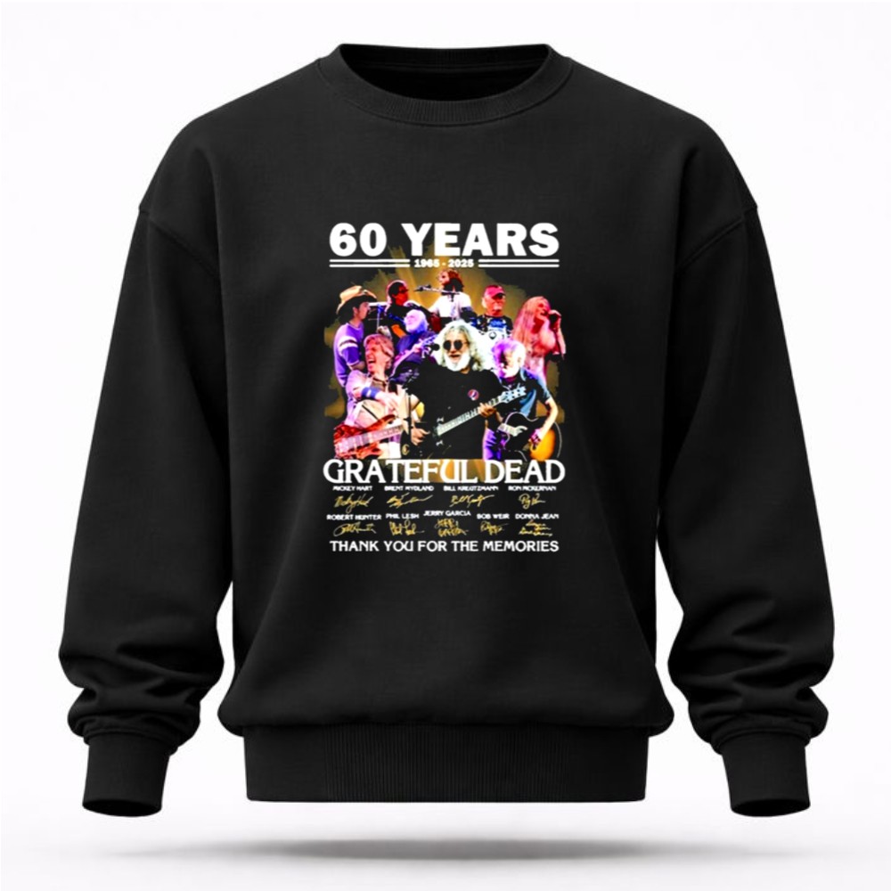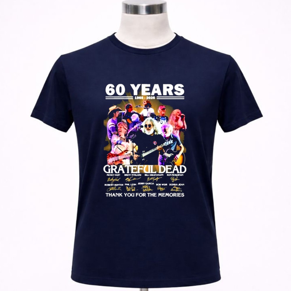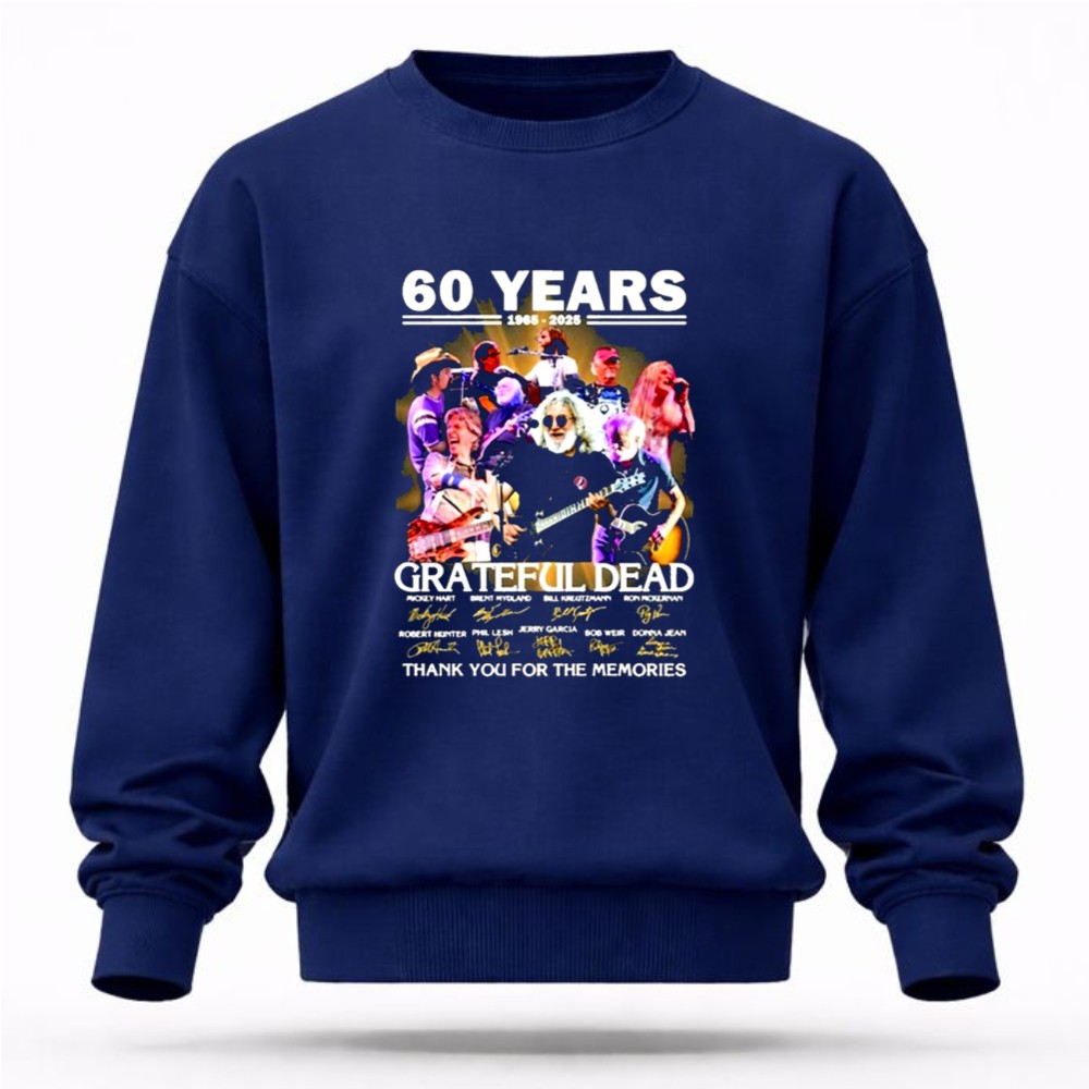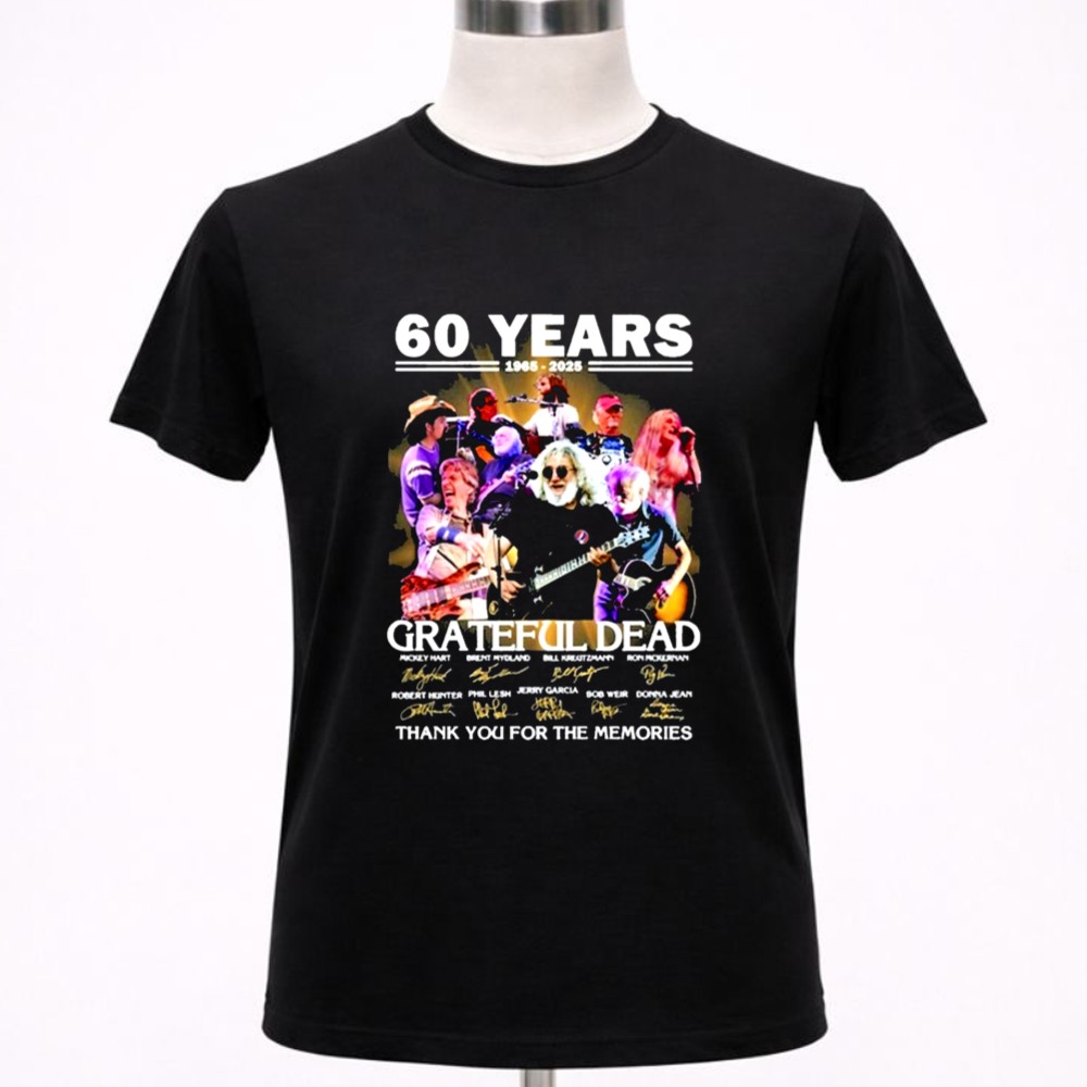 This design serves as a colorful collage of memories, intertwining the iconic signatures of Grateful Dead legends with a vintage tribute to their 60th anniversary. It reflects the deep emotional ties fans have formed through shared experiences and the profound impact of their music, celebrating a journey filled with joy, love, and unforgettable moments.