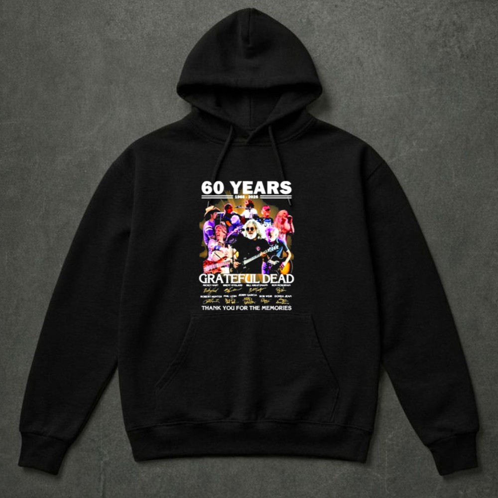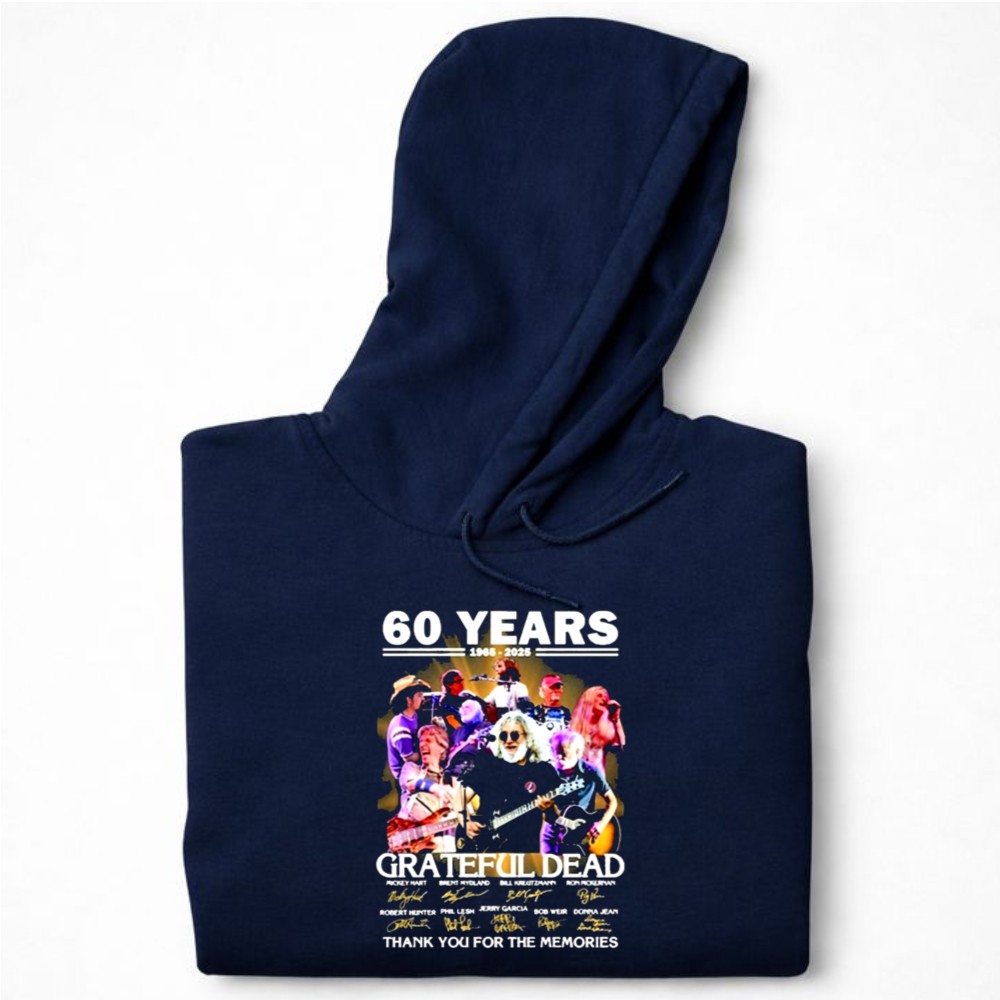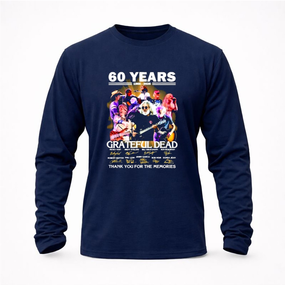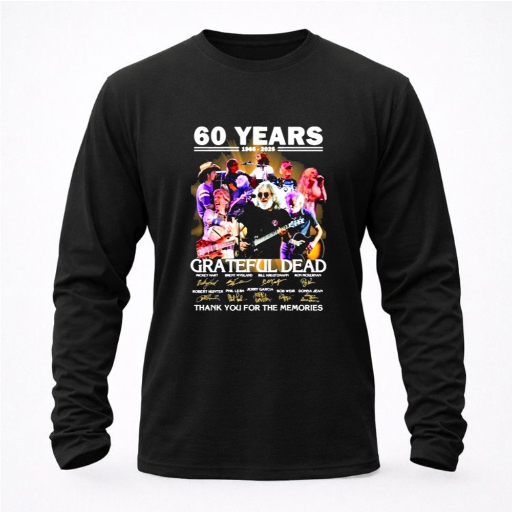 This design serves as a colorful collage of memories, intertwining the iconic signatures of Grateful Dead legends with a vintage tribute to their 60th anniversary. It reflects the deep emotional ties fans have formed through shared experiences and the profound impact of their music, celebrating a journey filled with joy, love, and unforgettable moments.