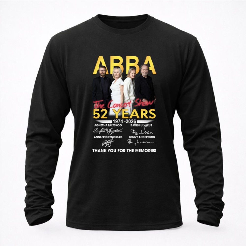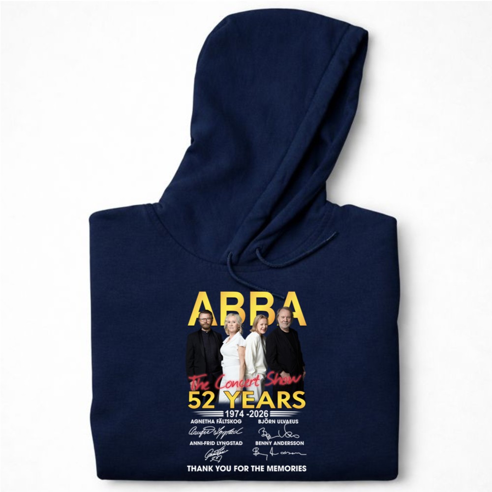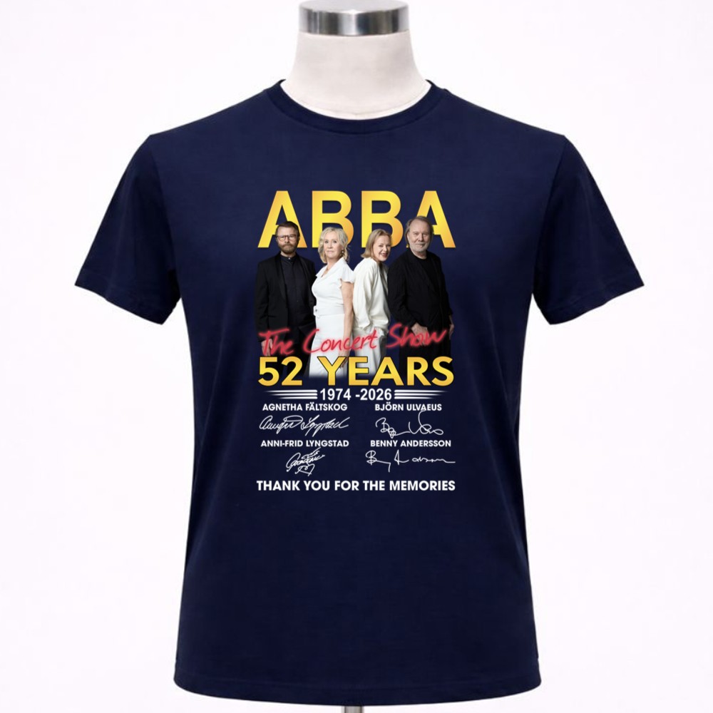 This design encapsulates the timeless spirit of ABBA, celebrating their 52-year journey through music. With bold lettering and a vintage concert aesthetic, it reflects the heartfelt gratitude of fans who have cherished every note and lyric. The signatures of Agnetha, Björn, Anni-Frid, and Benny serve as a tangible connection to the joy and nostalgia that their music has inspired over generations.
