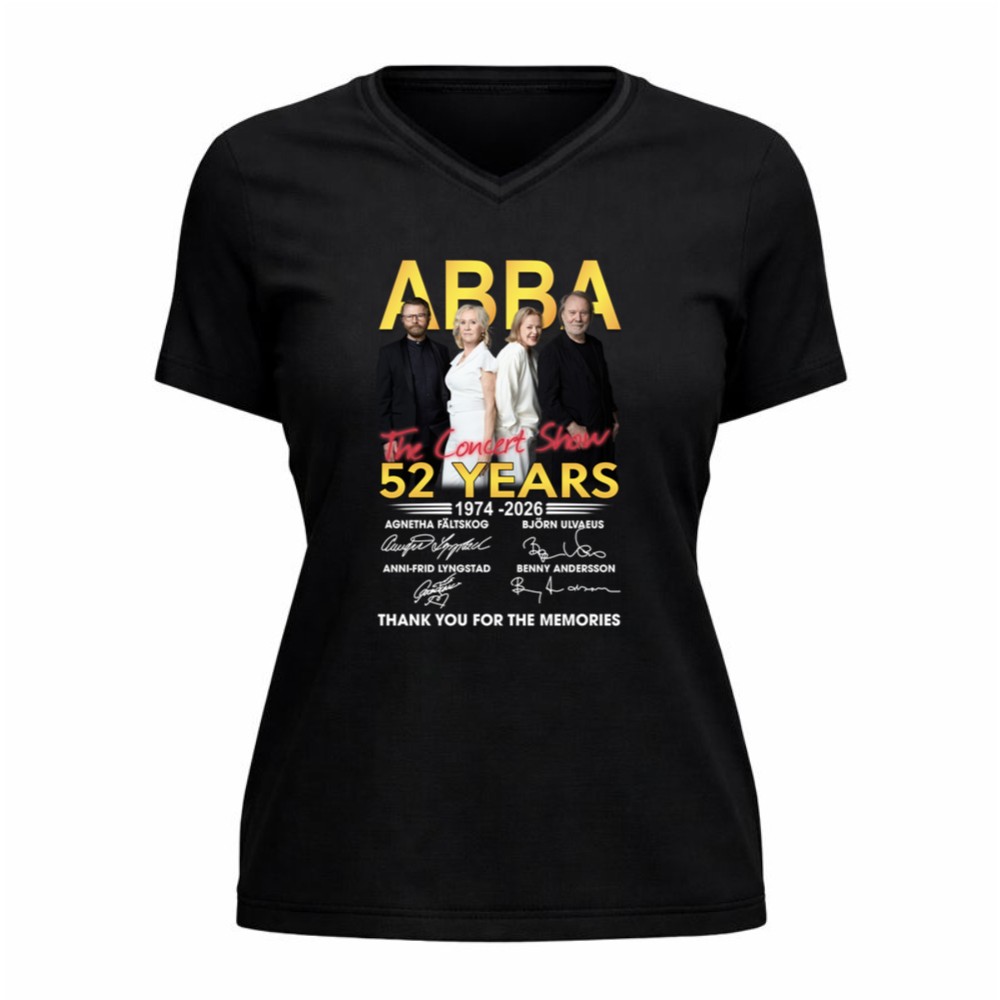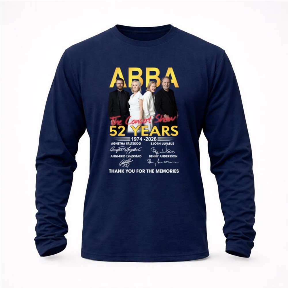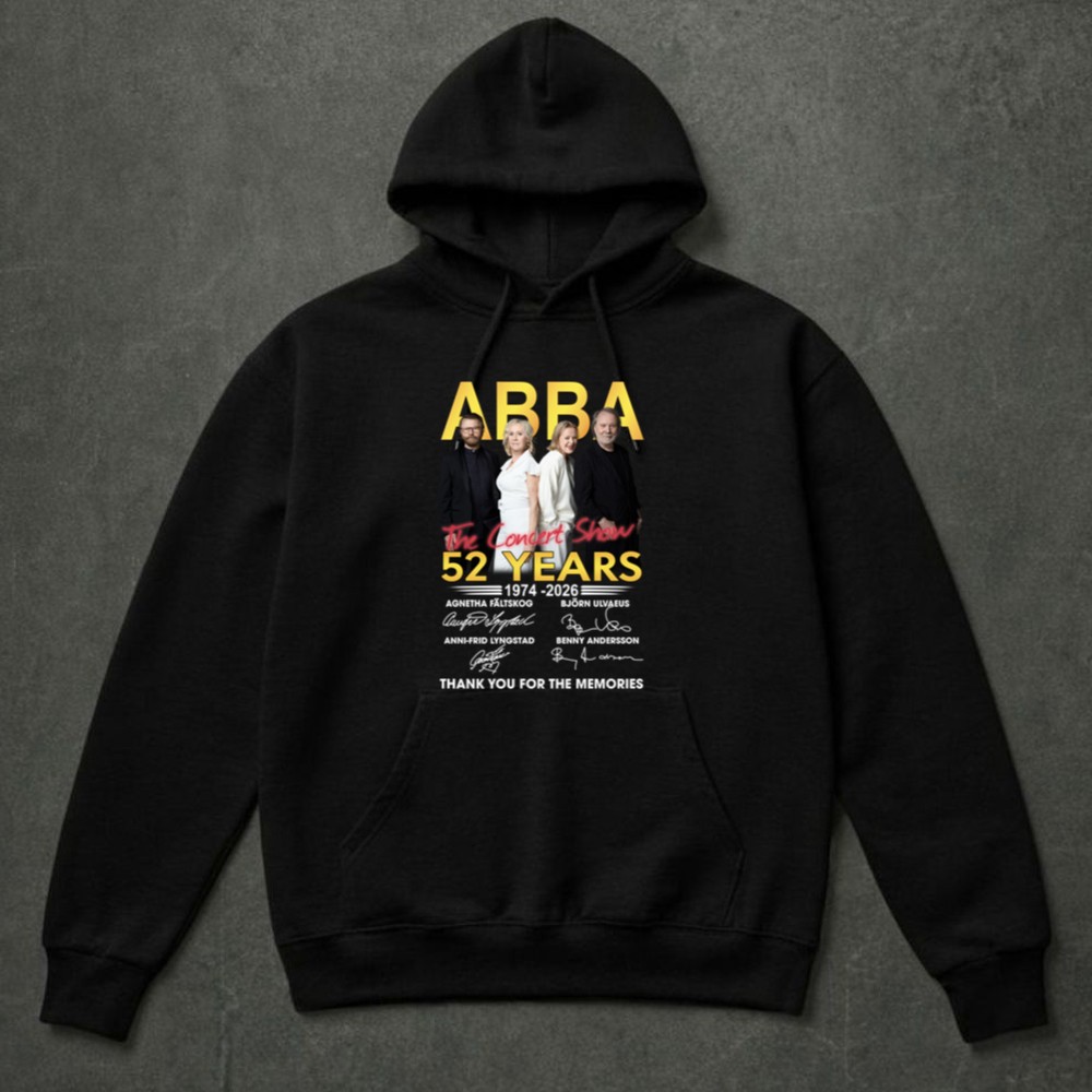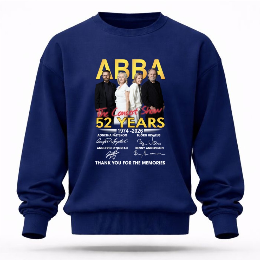 This design encapsulates the timeless spirit of ABBA, celebrating their 52-year journey through music. With bold lettering and a vintage concert aesthetic, it reflects the heartfelt gratitude of fans who have cherished every note and lyric. The signatures of Agnetha, Björn, Anni-Frid, and Benny serve as a tangible connection to the joy and nostalgia that their music has inspired over generations.