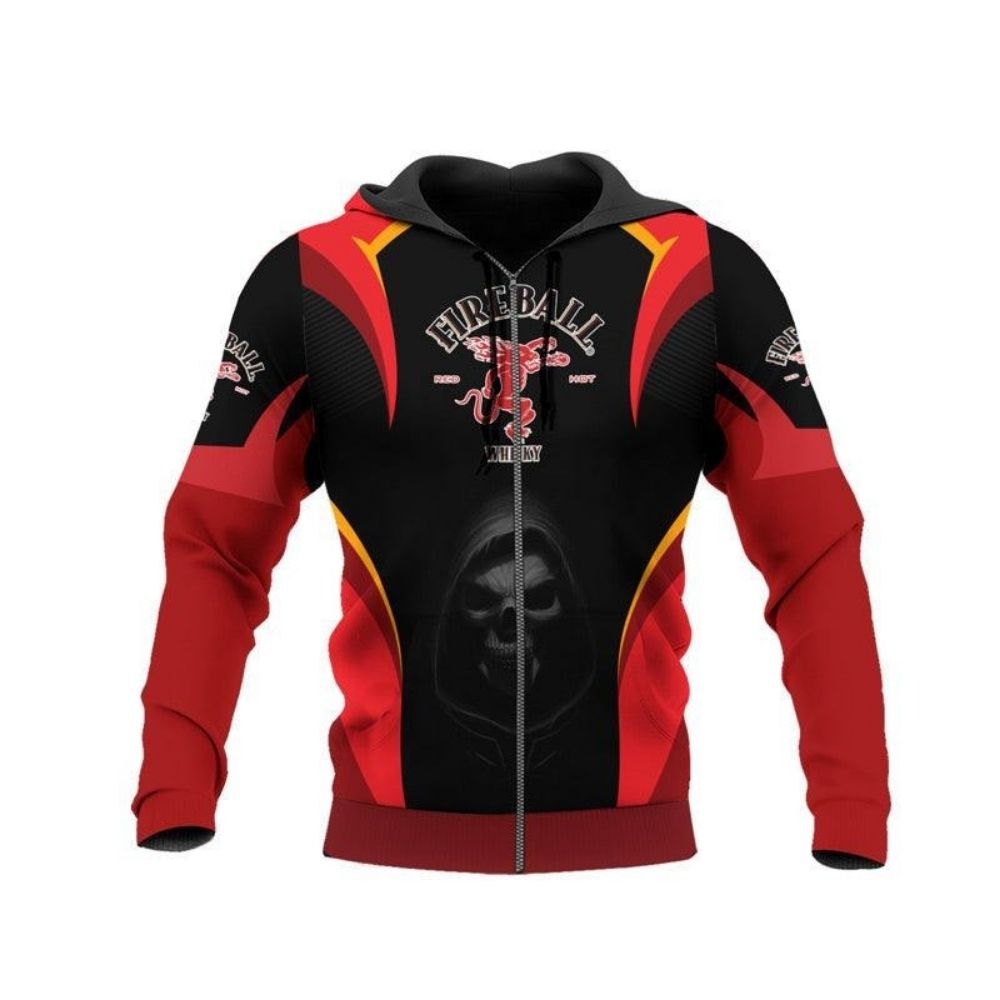 Get ready to turn heads with this edgy Black Skull Fireball Whisky All Over Print Hoodie. Stay warm in style with this unique and eye-catching design. Perfect for those who want to stand out from the crowd.