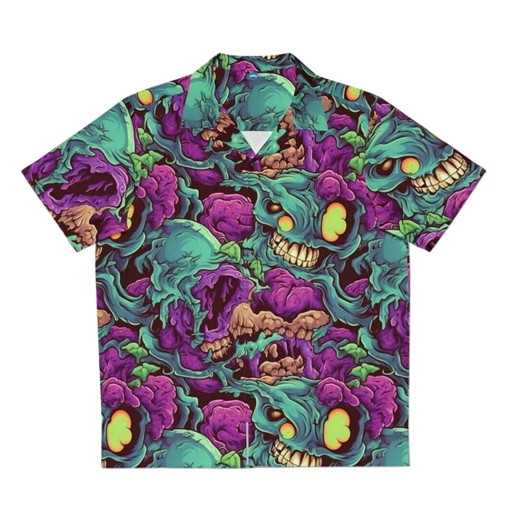 Get ready to turn heads with this Brain Feasting Zombie Horror Tropical Hawaiian Shirt. Perfect for standing out at any event or party. Shop now and unleash your unique style!