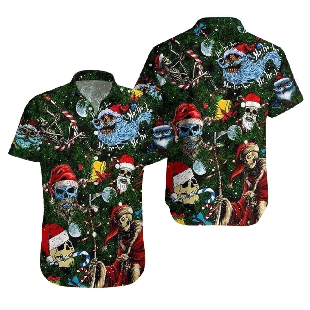 Get into the holiday spirit with this unique Christmas Ho Ho Ho Santa Skull Hawaiian Shirt. Perfect for standing out at festive gatherings and spreading some cheer with a twist.