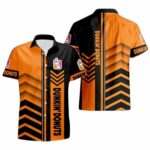 Show your love for Dunkin’ Donuts with this vibrant orange and black Hawaiian shirt featuring the iconic logo. Perfect for standing out in style!