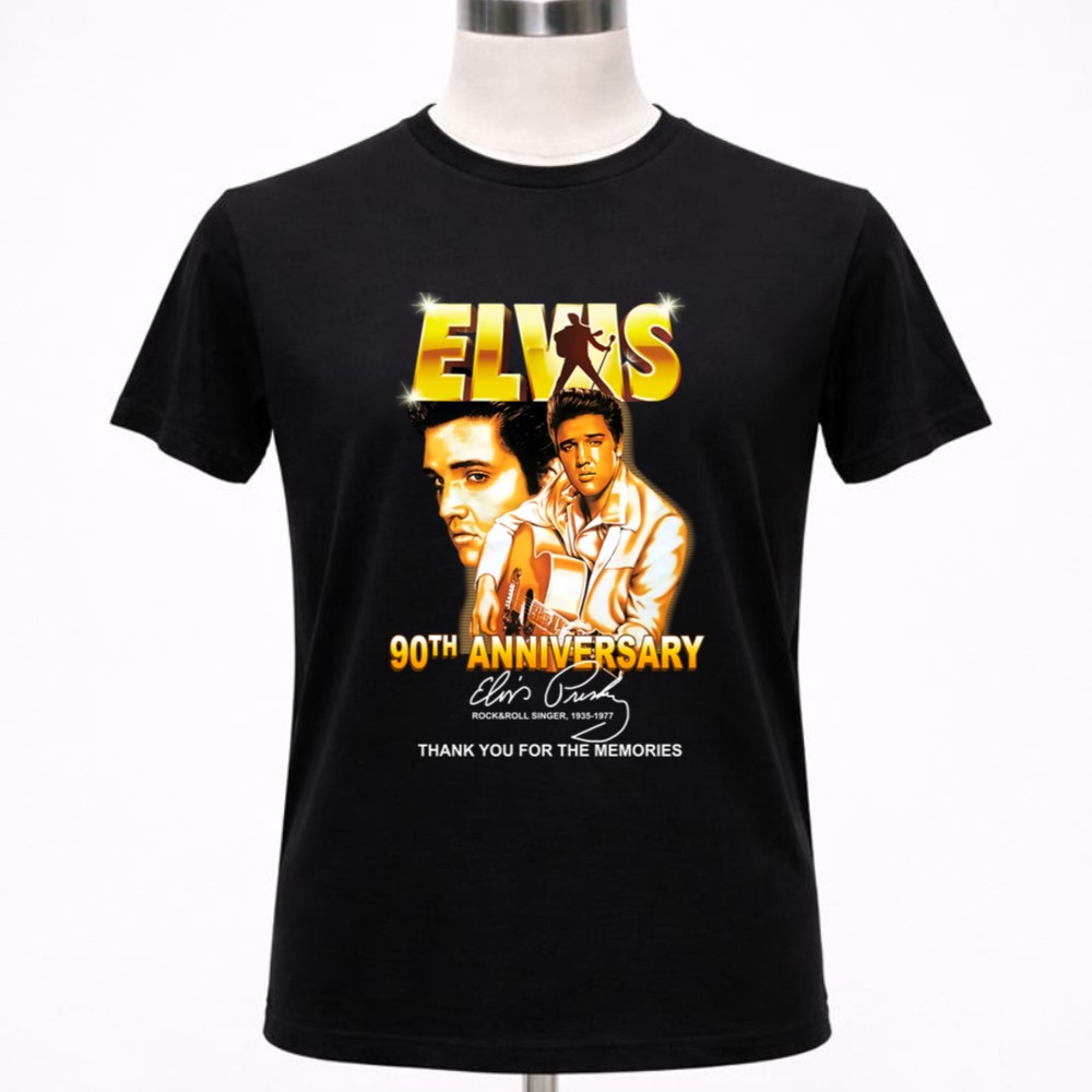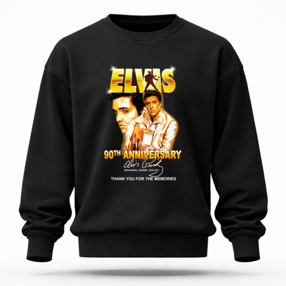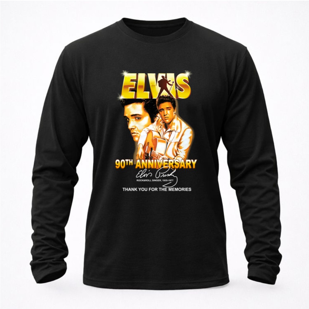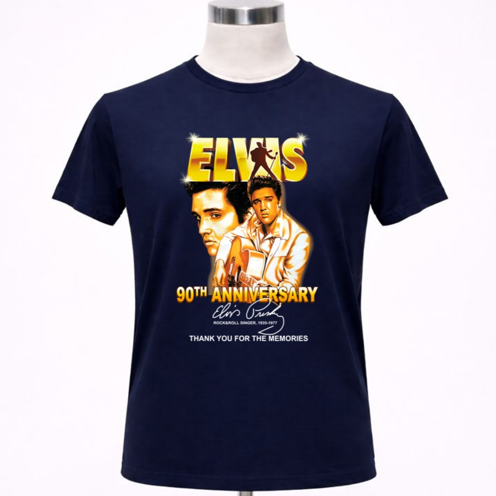 This design serves as a heartfelt homage to Elvis Presley on the milestone of his 90th anniversary. With bold graphics that celebrate his legacy, it invites wearers to reflect on the joy and nostalgia he brought to countless fans. The phrase ‘Thank You for the Memories’ resonates deeply, honoring a musical journey that has shaped generations.
