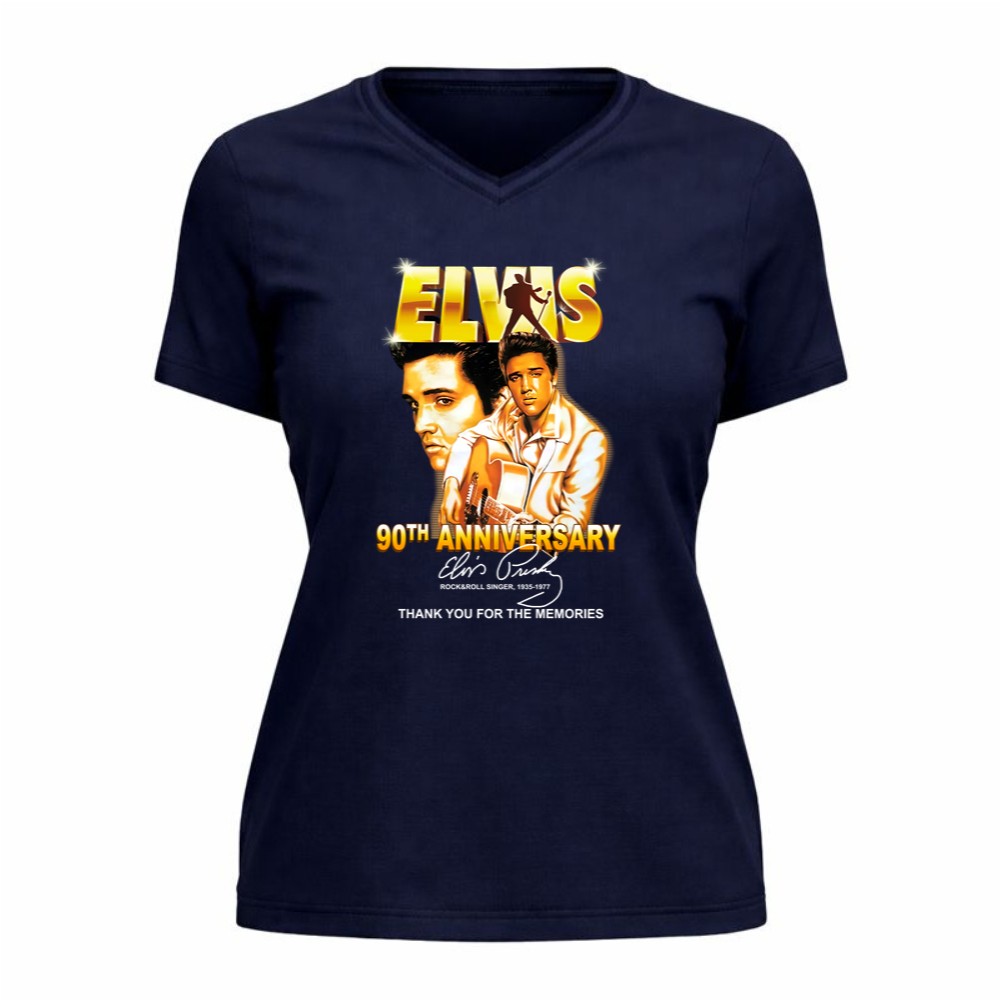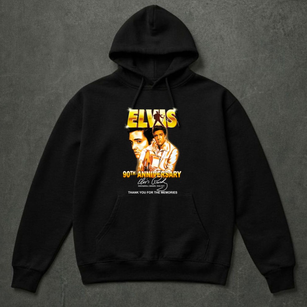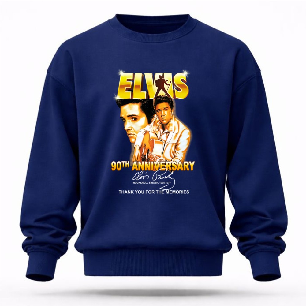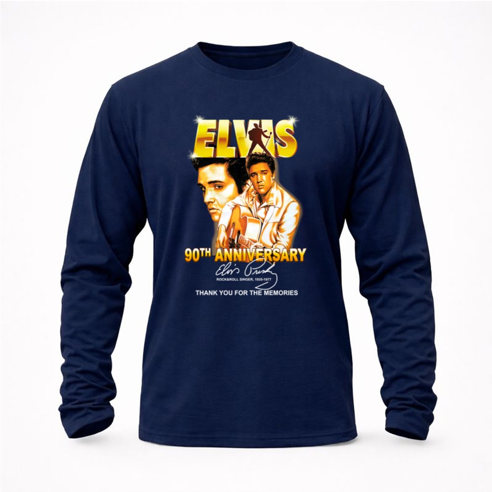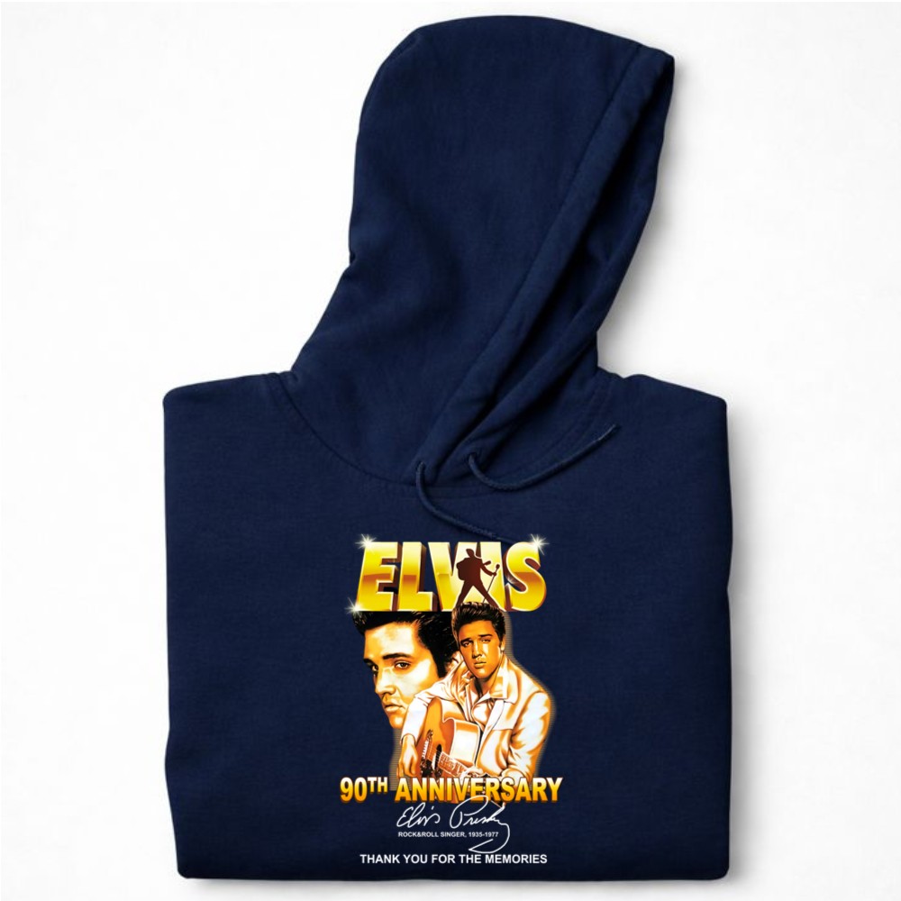 This design serves as a heartfelt homage to Elvis Presley on the milestone of his 90th anniversary. With bold graphics that celebrate his legacy, it invites wearers to reflect on the joy and nostalgia he brought to countless fans. The phrase ‘Thank You for the Memories’ resonates deeply, honoring a musical journey that has shaped generations.