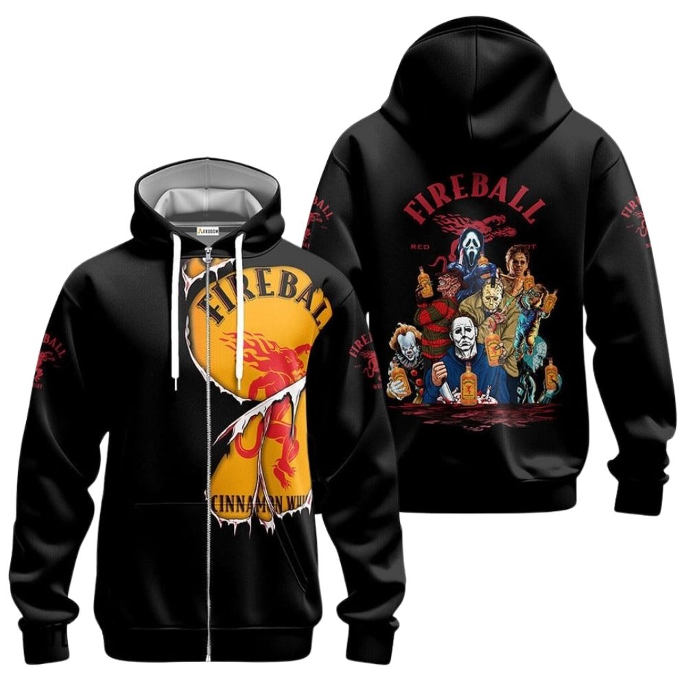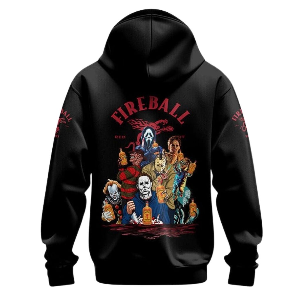 Get into the Halloween spirit with this Fireball Whisky Michael Myers And Friends Horror Characters Hoodie. Perfect for horror fans looking to add a touch of fright to their wardrobe.