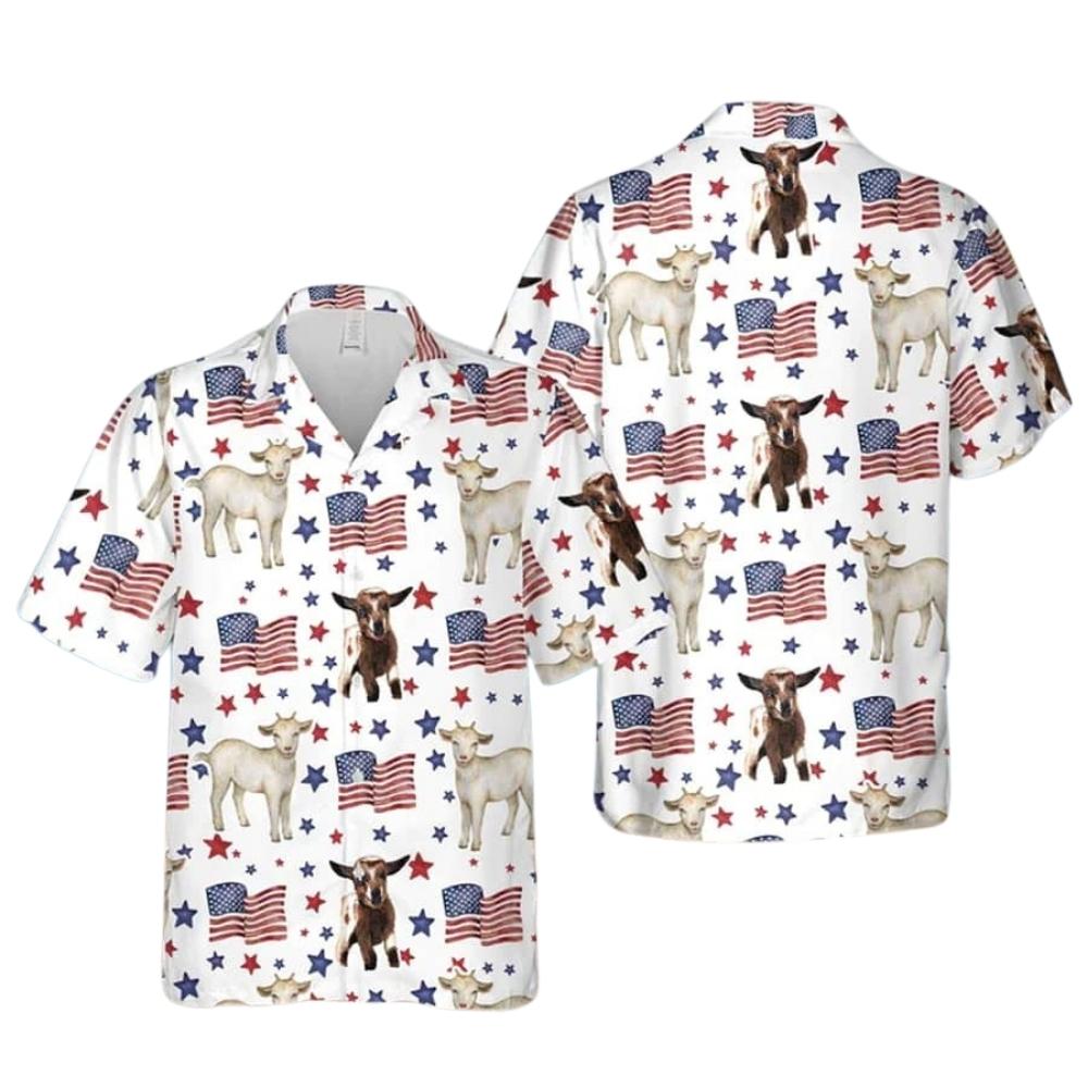 Show off your patriotic spirit with this Goat American Flag Pattern Hawaiian Shirt. Perfect for any occasion, this shirt is sure to turn heads and make a statement. Stand out from the crowd and express your unique style with this bold and eye-catching design.