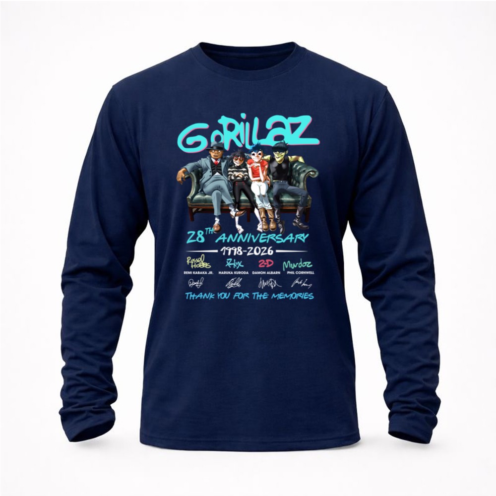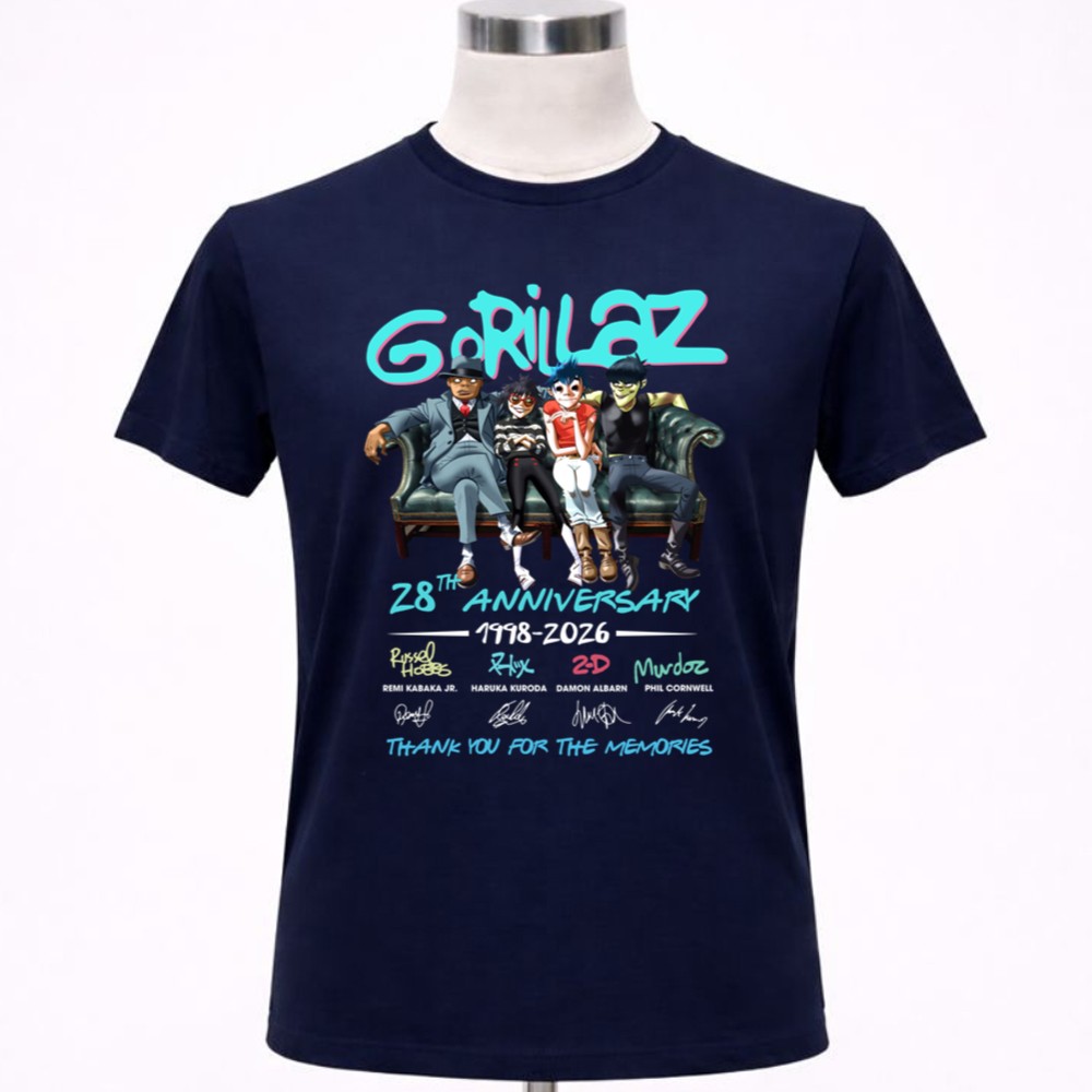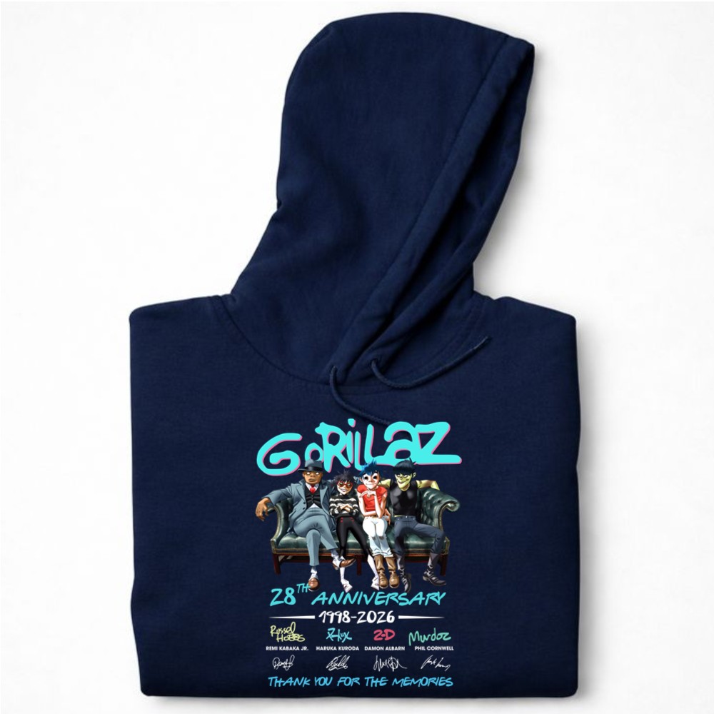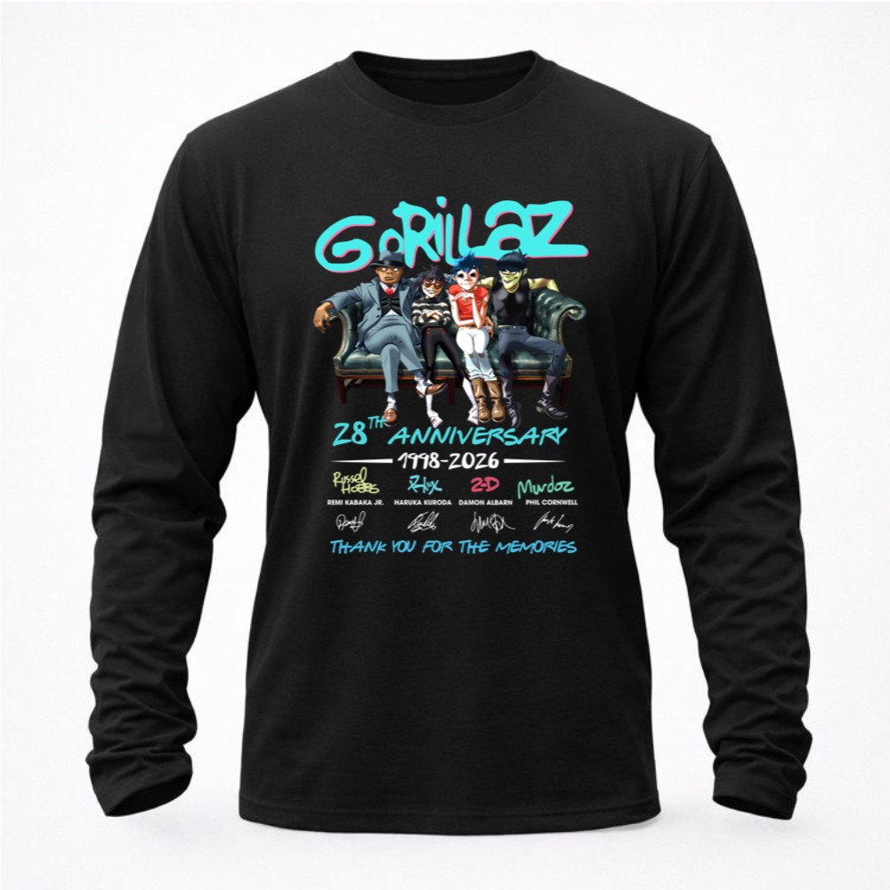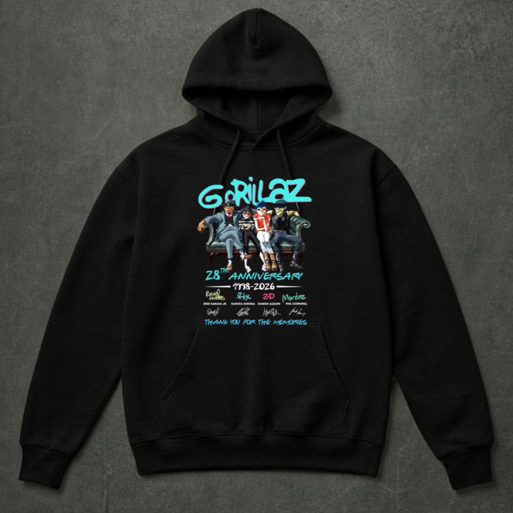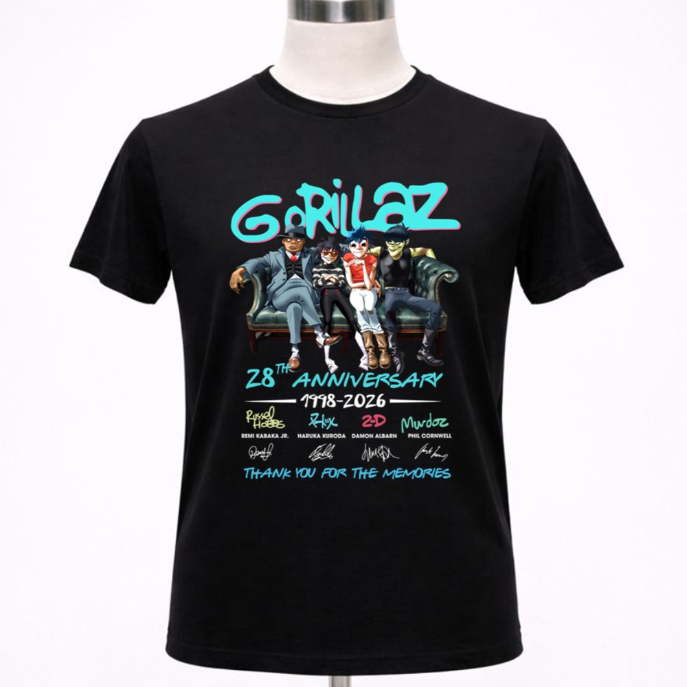 This design captures the essence of the Gorillaz’s journey from 1998 to 2026, featuring beloved characters like 2D, Murdoc, Noodle, and Russel Hobbs. It’s a vibrant animated tribute that celebrates music nostalgia and unity, honoring the unforgettable memories created by this groundbreaking band. Each signature adds a personal touch, inviting fans to reflect on the legacy they’ve built together.