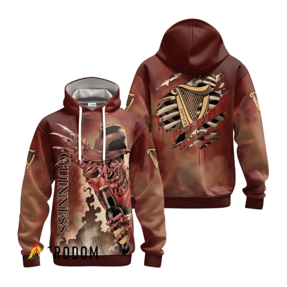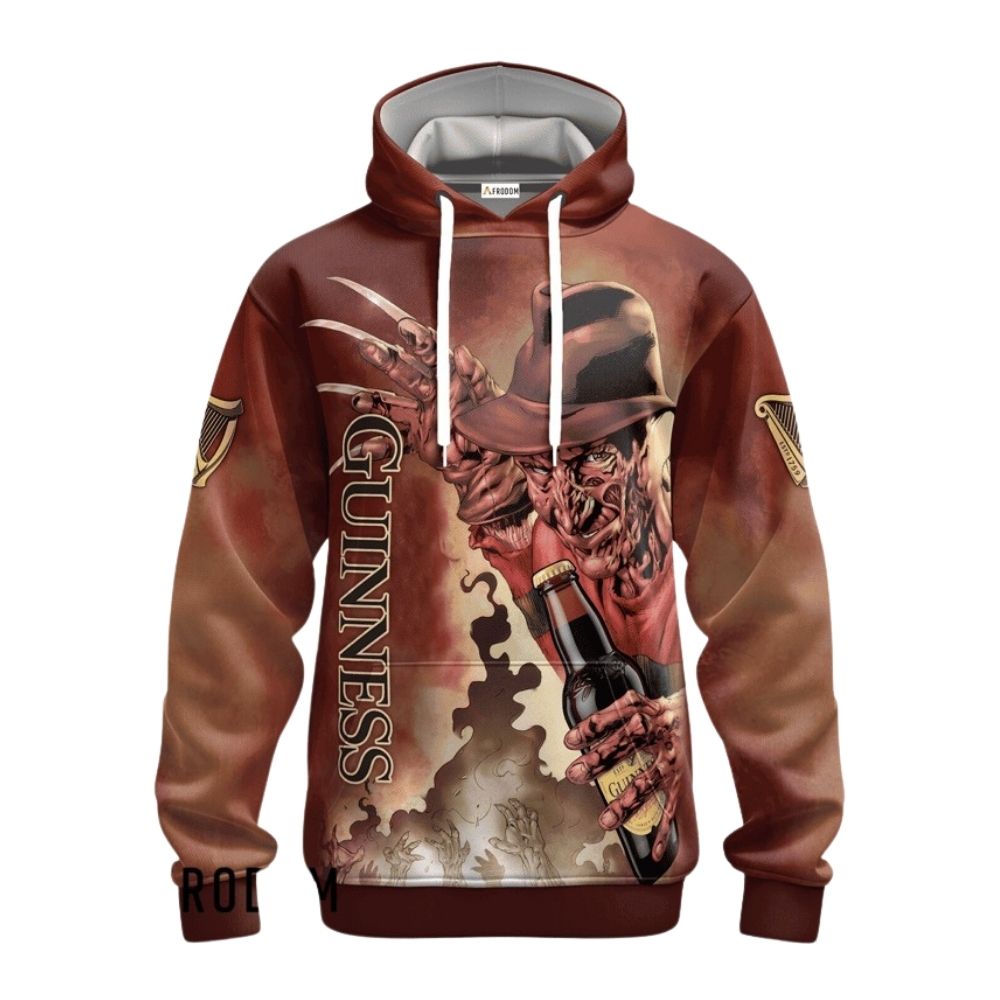 Get into the Halloween spirit with this Guinness Beer Freddy Krueger All Over Print Hoodie. Perfect for horror movie fans and beer enthusiasts alike. Stand out from the crowd with this unique and spooky hoodie.