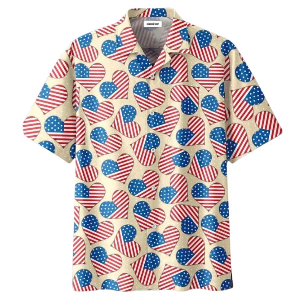 Celebrate Independence Day in style with this patriotic Hawaiian shirt featuring a heart pattern. Perfect for showing off your American pride at any summer gathering.
