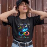 Show your support for autism awareness with this vibrant and meaningful shirt featuring an infinity symbol, colorful feathers, puzzle pieces, and flying butterflies. Wear blue proudly and spread awareness with this unique design.