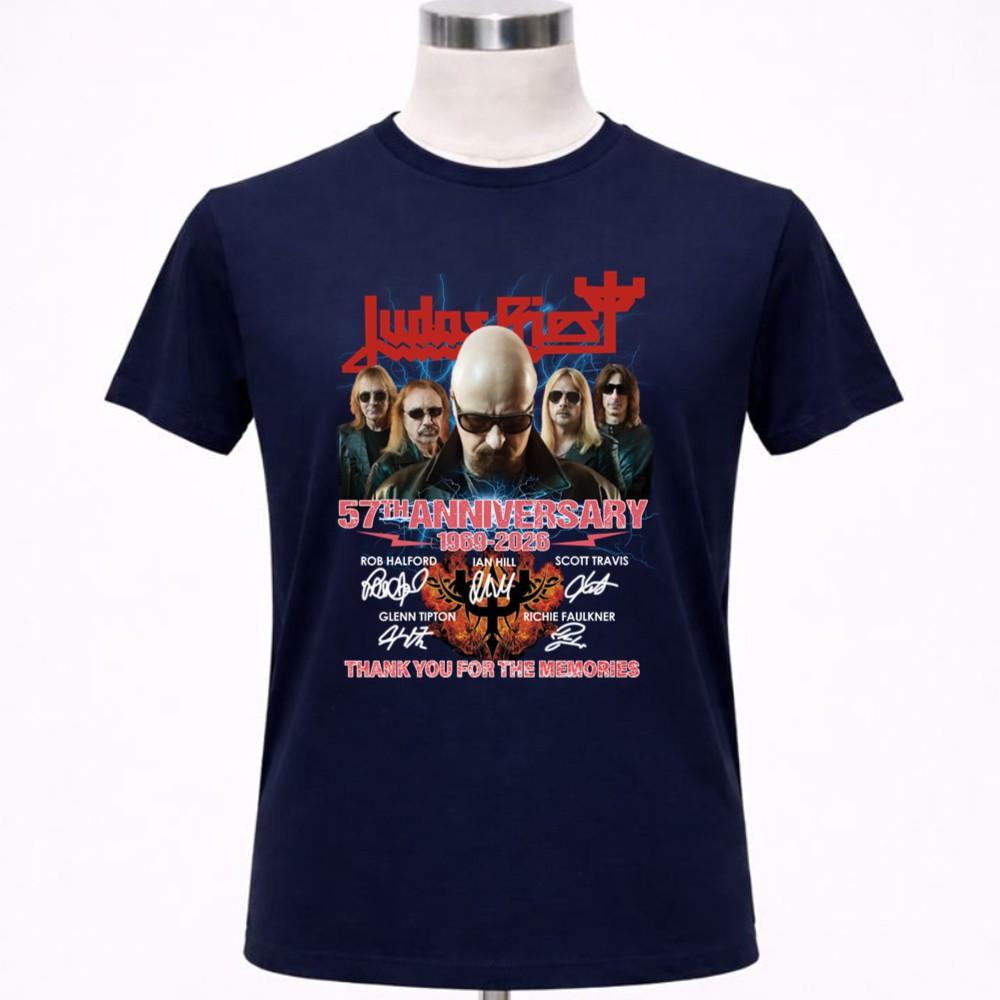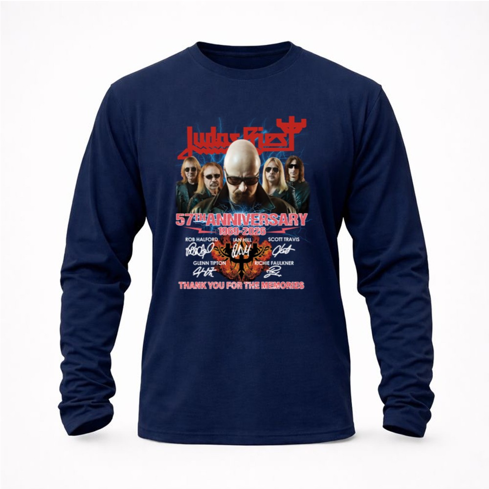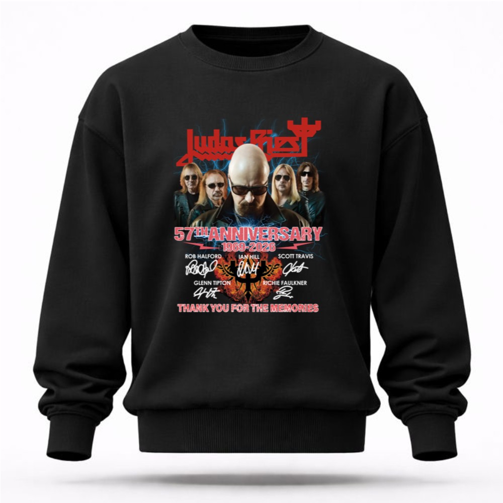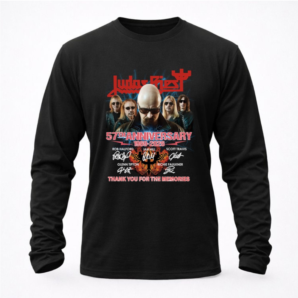 This design encapsulates the essence of Judas Priest’s remarkable legacy, merging bold graphics with the heartfelt signatures of its iconic lineup. The phrase ‘THANK YOU FOR THE MEMORIES’ serves as a tribute to the countless fans who have celebrated the band’s music over the decades, evoking a sense of nostalgia and gratitude for a shared passion that has defined generations.
