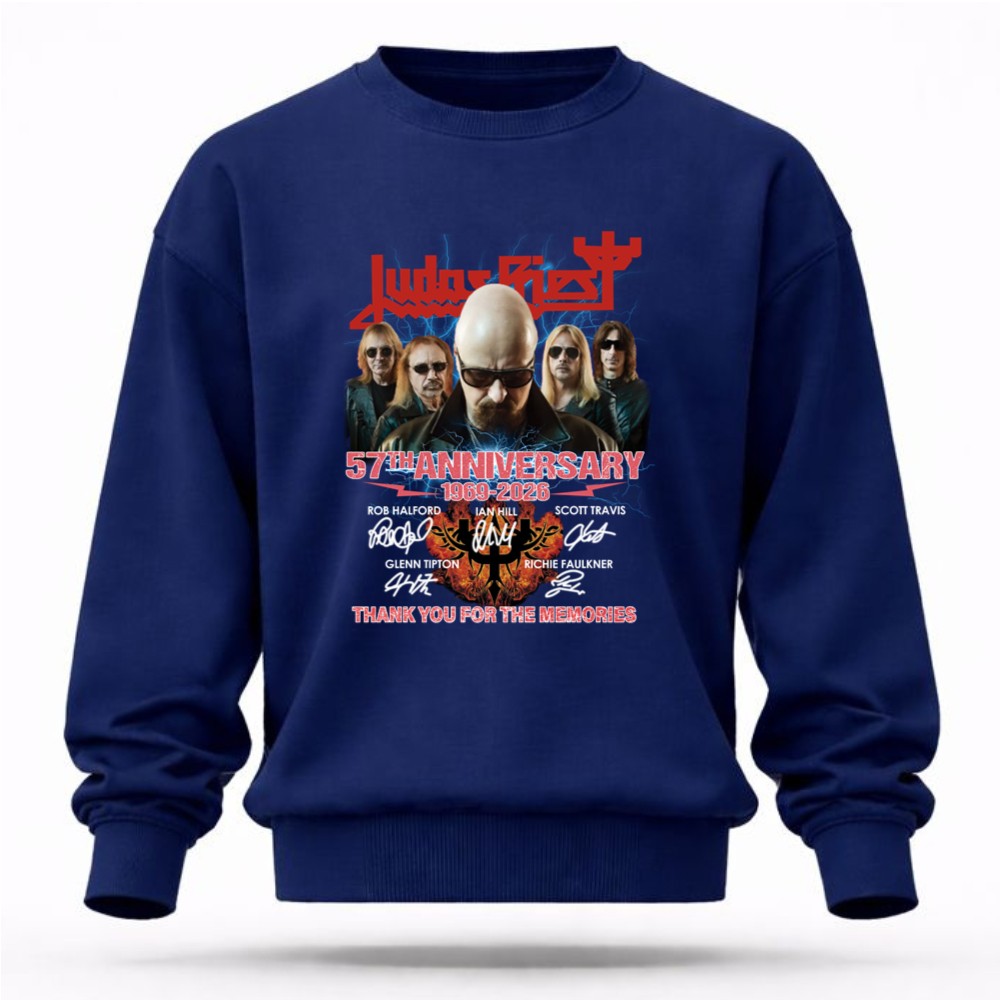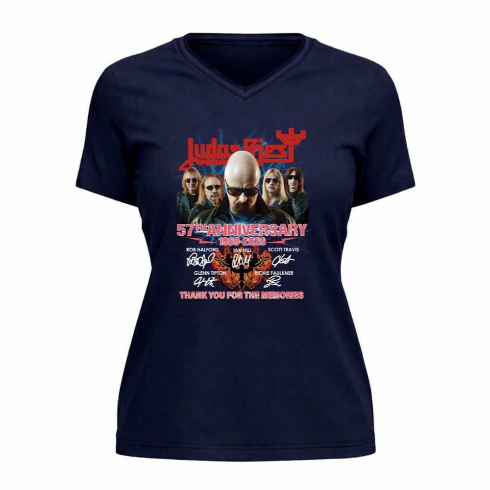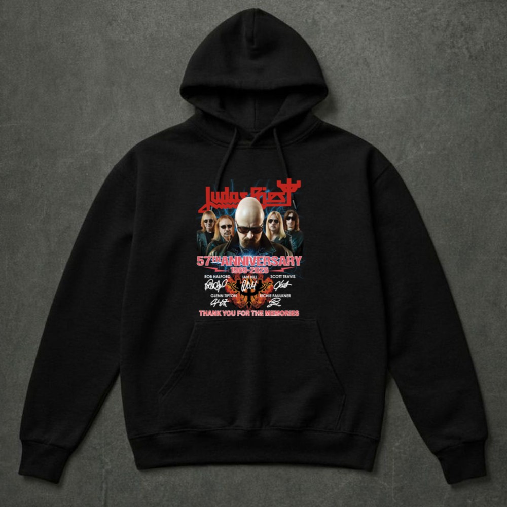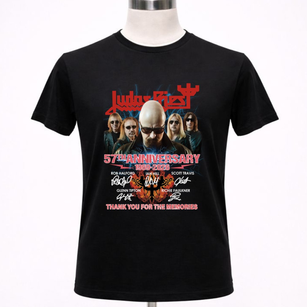 This design encapsulates the essence of Judas Priest’s remarkable legacy, merging bold graphics with the heartfelt signatures of its iconic lineup. The phrase ‘THANK YOU FOR THE MEMORIES’ serves as a tribute to the countless fans who have celebrated the band’s music over the decades, evoking a sense of nostalgia and gratitude for a shared passion that has defined generations.