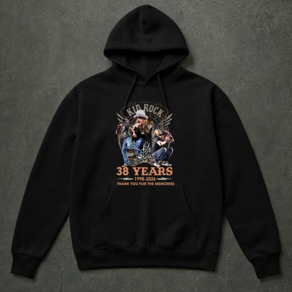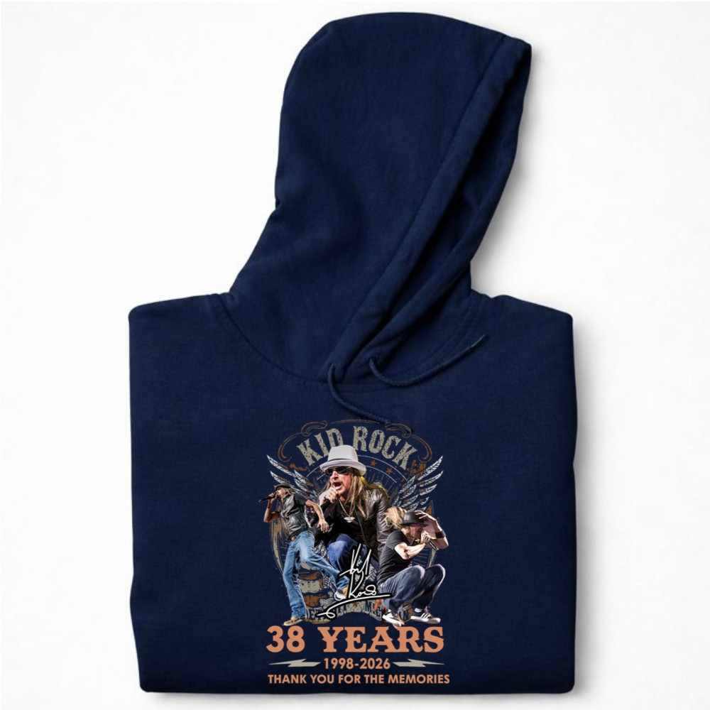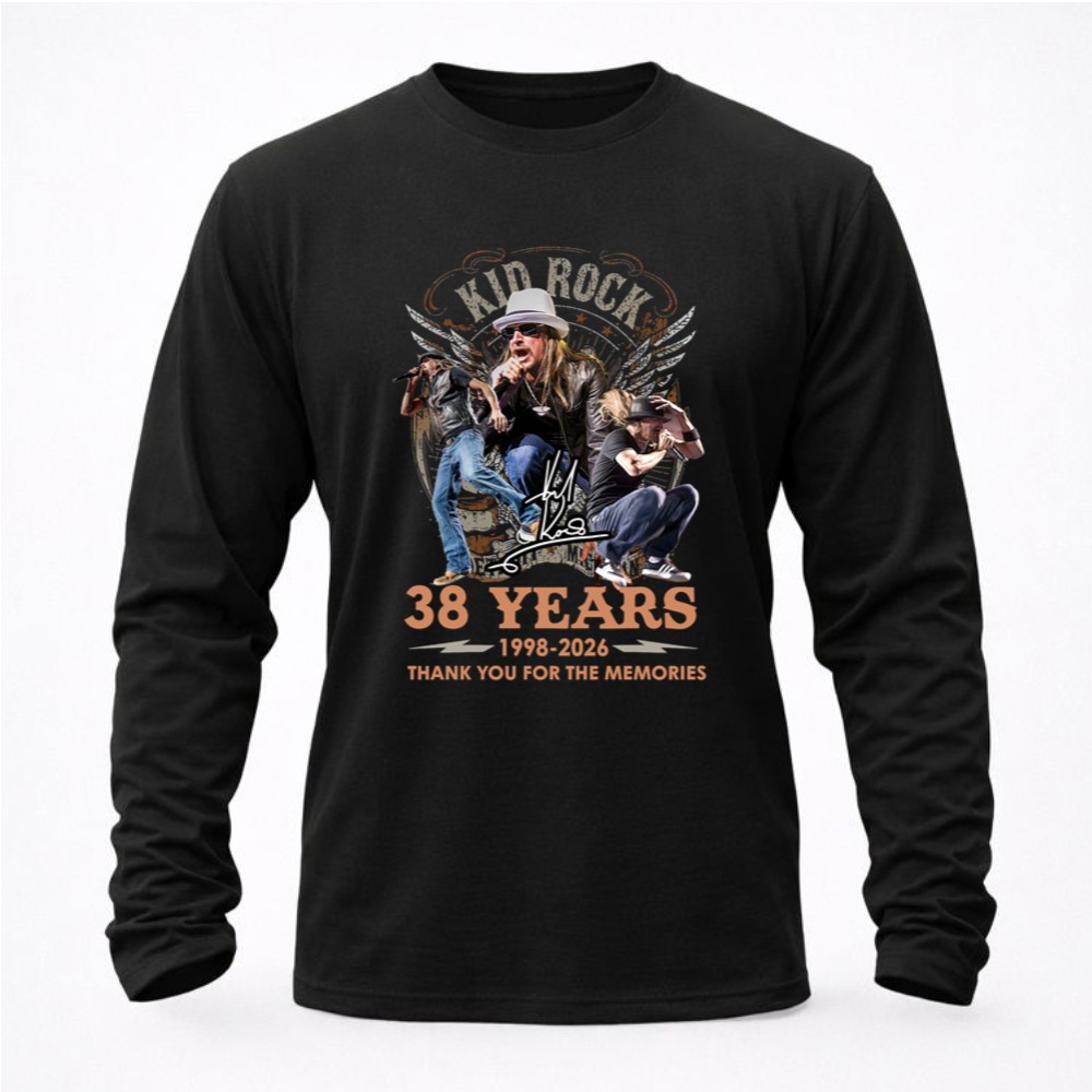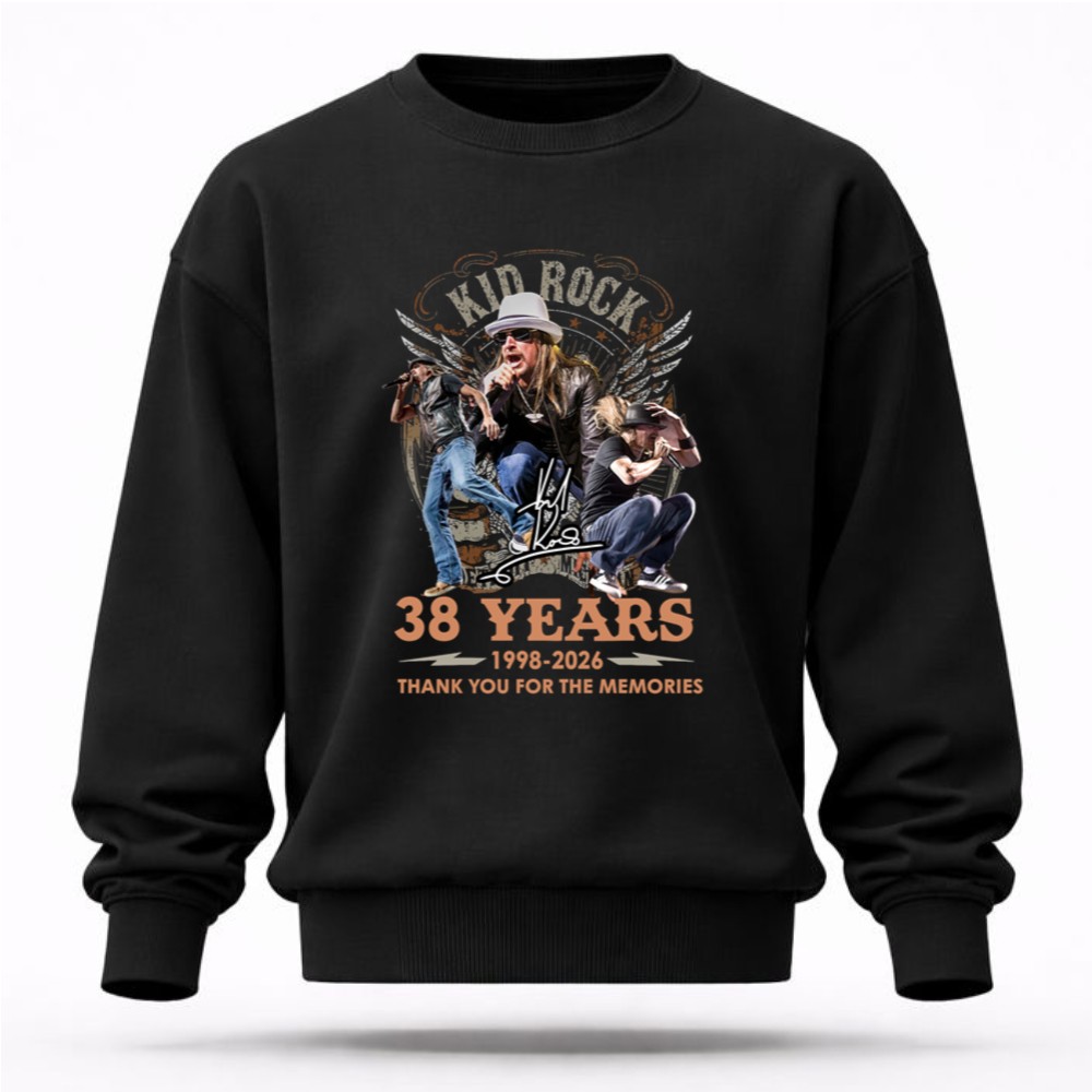 This design encapsulates the essence of Kid Rock’s remarkable journey through music, celebrating 38 years of unforgettable performances and memories. With a vintage rock aesthetic, it pays tribute to the artist’s impact on fans and the culture he helped shape. Each element is a reminder of the joy and pride felt by those who have followed his career.