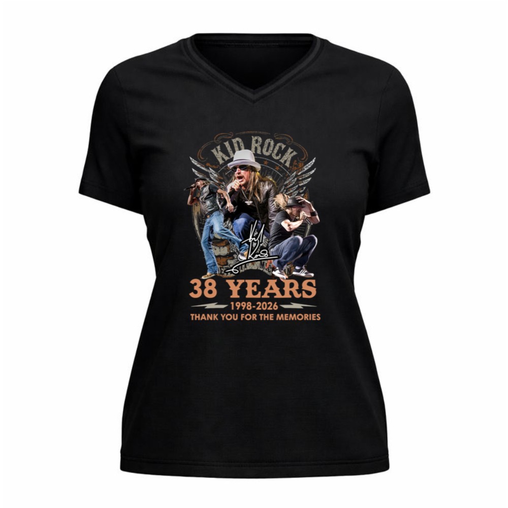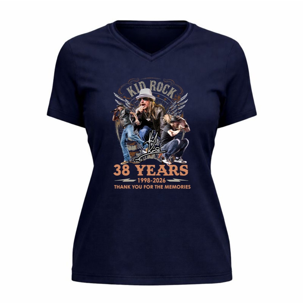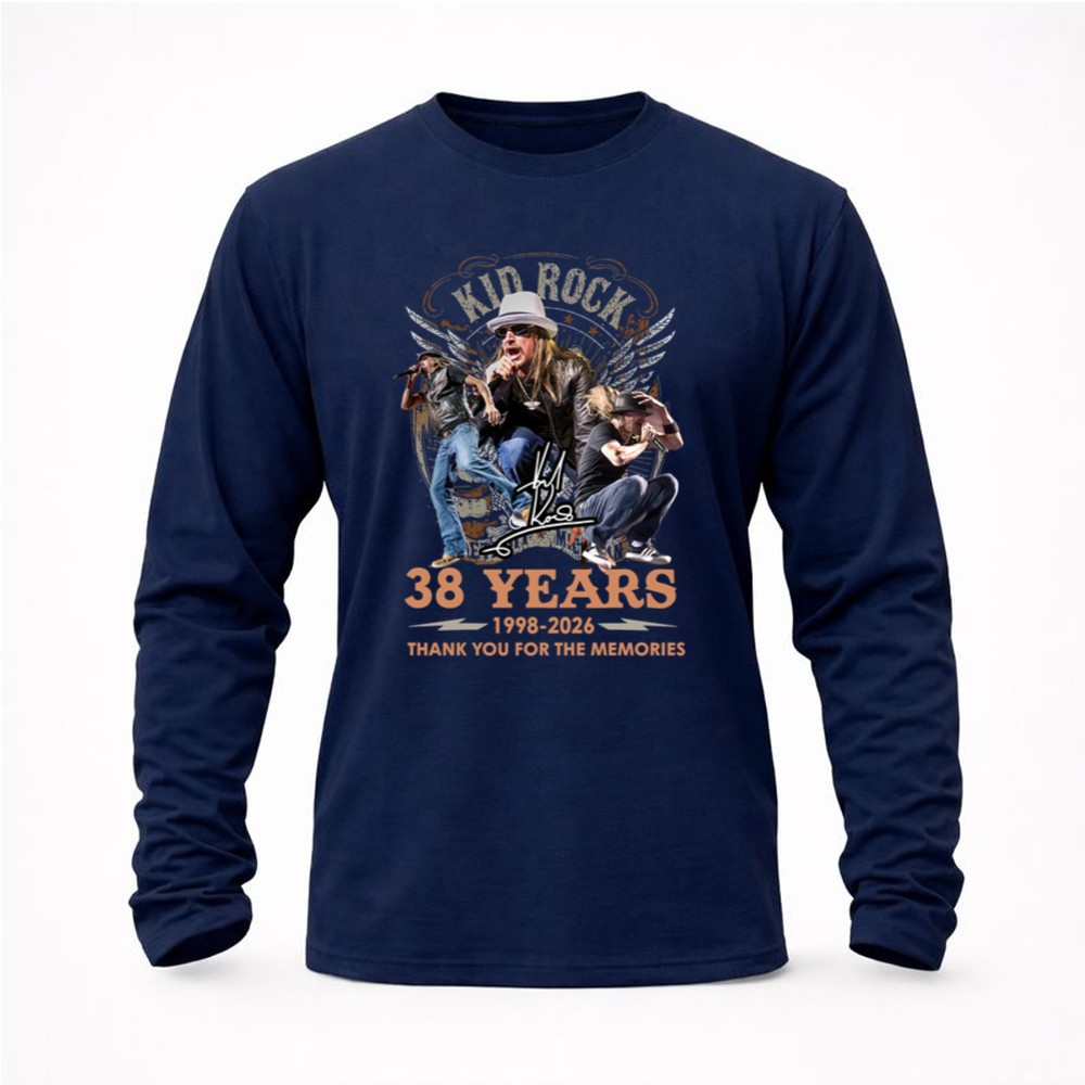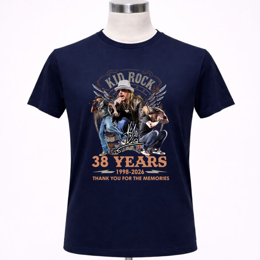 This design encapsulates the essence of Kid Rock’s remarkable journey through music, celebrating 38 years of unforgettable performances and memories. With a vintage rock aesthetic, it pays tribute to the artist’s impact on fans and the culture he helped shape. Each element is a reminder of the joy and pride felt by those who have followed his career.
