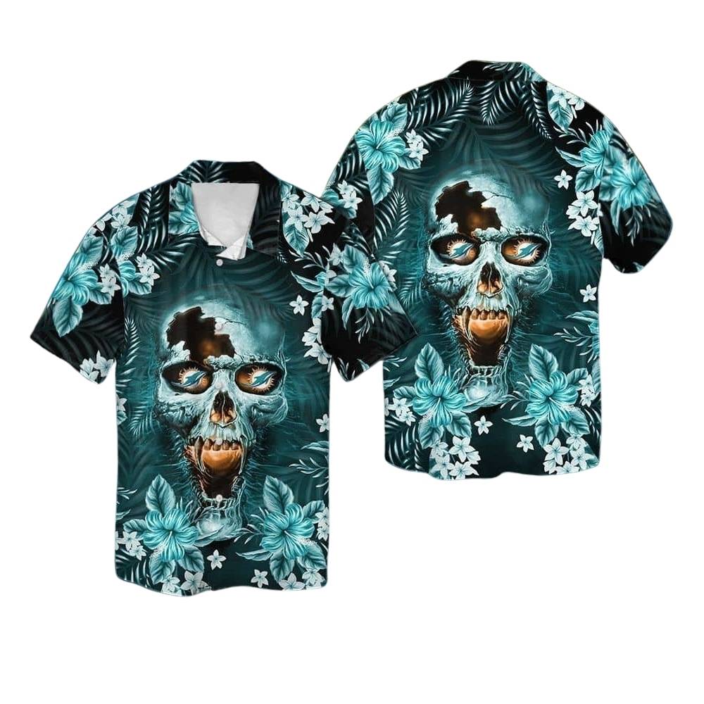 Add a touch of tropical flair to your wardrobe with this Miami Dolphins skull floral Hawaiian shirt. Perfect for standing out at the next beach party or summer event.