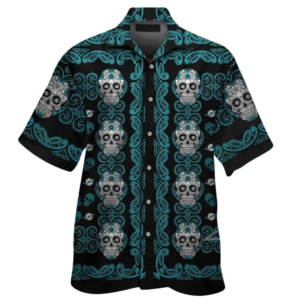 Add a touch of tropical flair to your wardrobe with this Miami Dolphins skull sugar floral Hawaiian shirt. Perfect for standing out at the beach or a summer party.