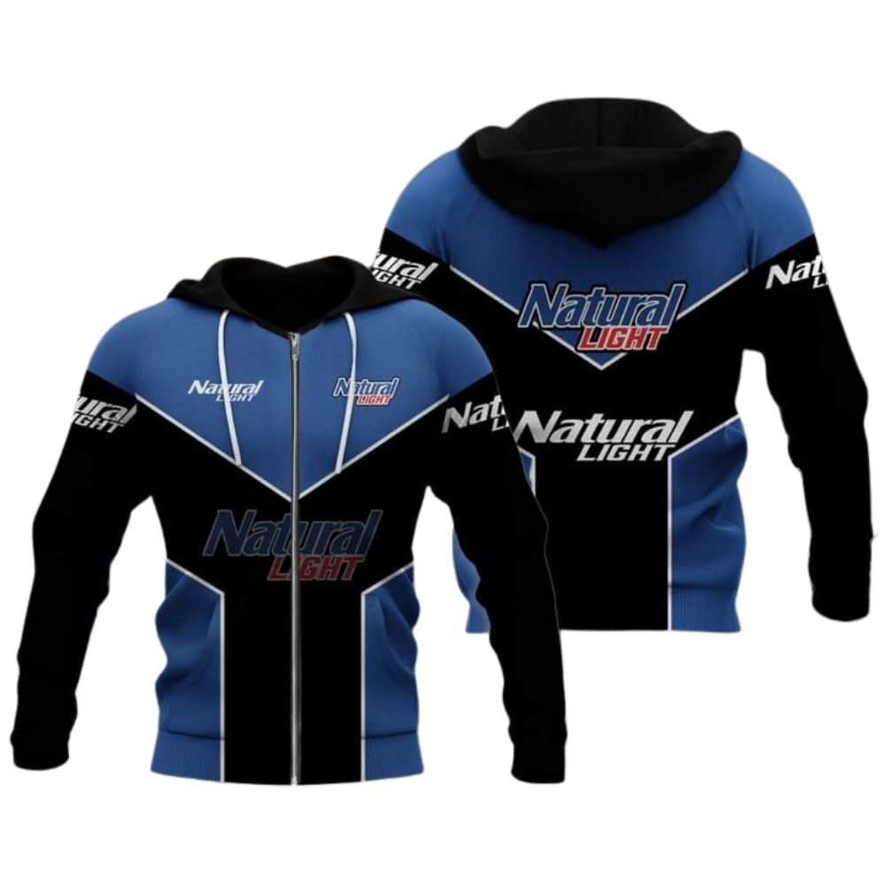 Show your love for Natural Light with this black and blue all-over print hoodie featuring the iconic logo in your heart. Stay warm and stylish while representing your favorite beverage.