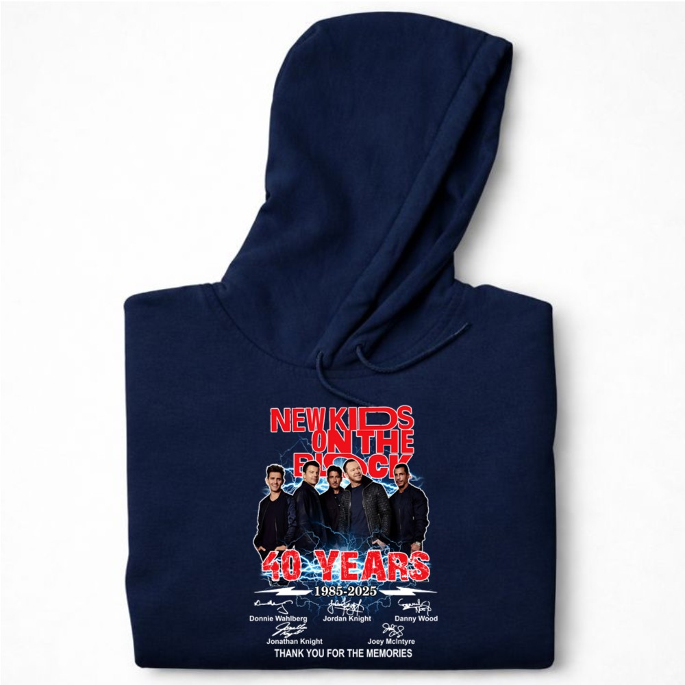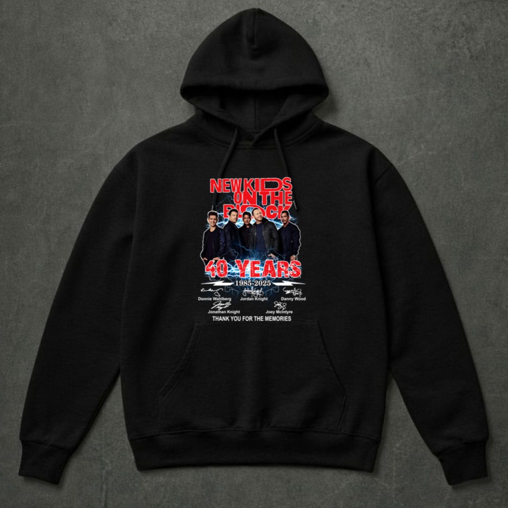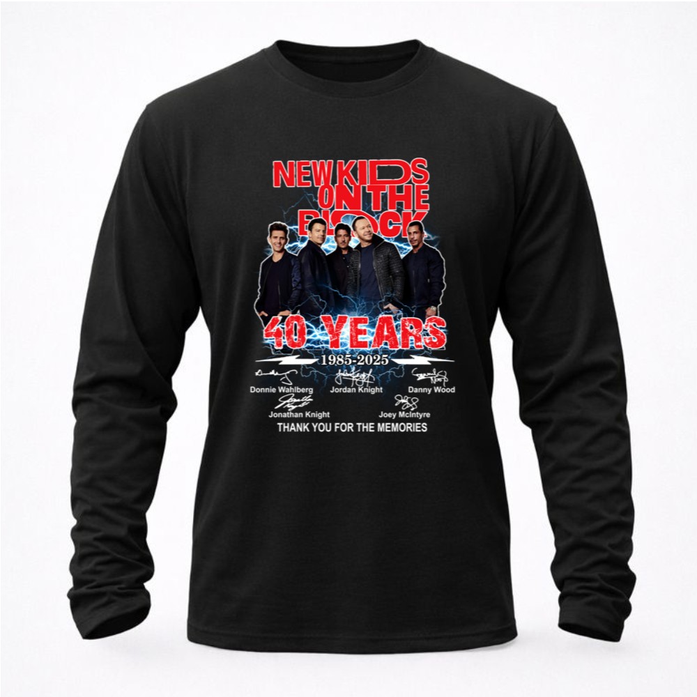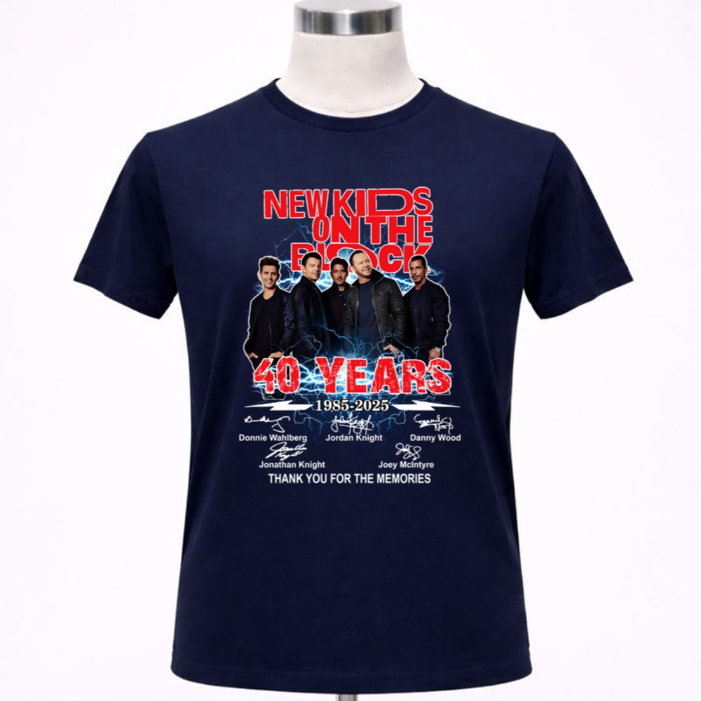 New Kids on the Block merchandise, 40th anniversary t-shirt, 1980s boy band tribute, NKOTB signatures, nostalgic concert apparel, fan memorabilia, music legends, thank you for the memories shirt