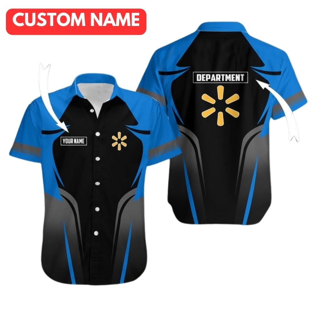 Show your love for Walmart with this personalized Hawaiian shirt featuring the iconic logo in black, blue, and grey. Stand out in style with this unique and eye-catching design.