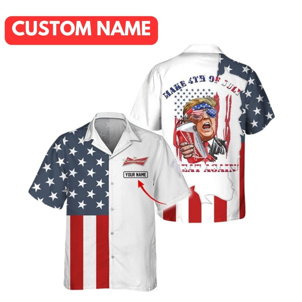 Celebrate Independence Day in style with a personalized Budweiser Donald Trump Hawaiian shirt. Stand out from the crowd with this unique and patriotic shirt featuring iconic American imagery. Perfect for BBQs, parties, or just showing off your American pride. Get yours today!