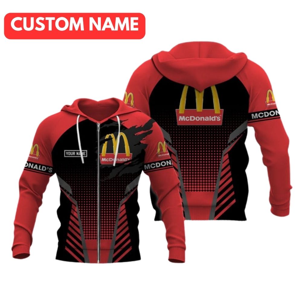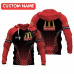 Show your love for McDonald’s with this personalized logo “McDonalds In My Heart” scratch black and red all-over print hoodie. Stay warm and stylish while representing your favorite fast-food chain.