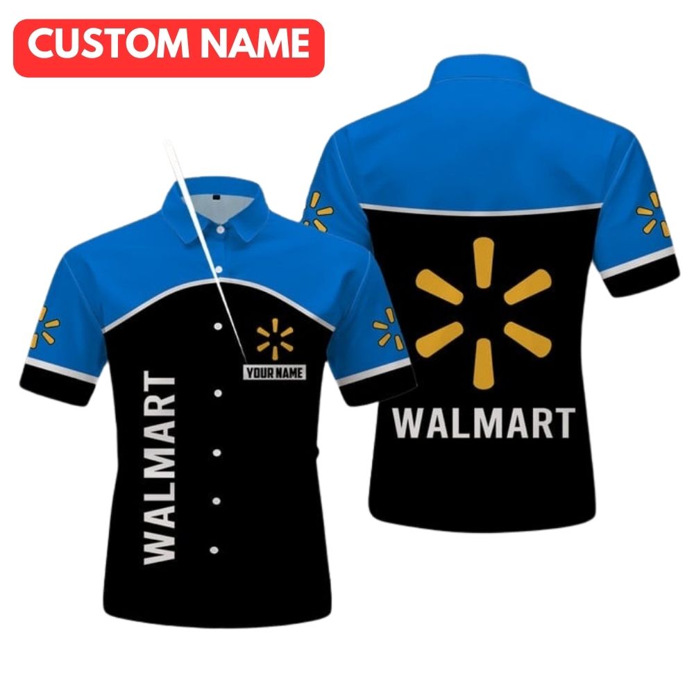 Show your love for Walmart with this personalized black and blue Hawaiian shirt featuring the iconic Walmart logo in a heart design. Perfect for standing out in style!