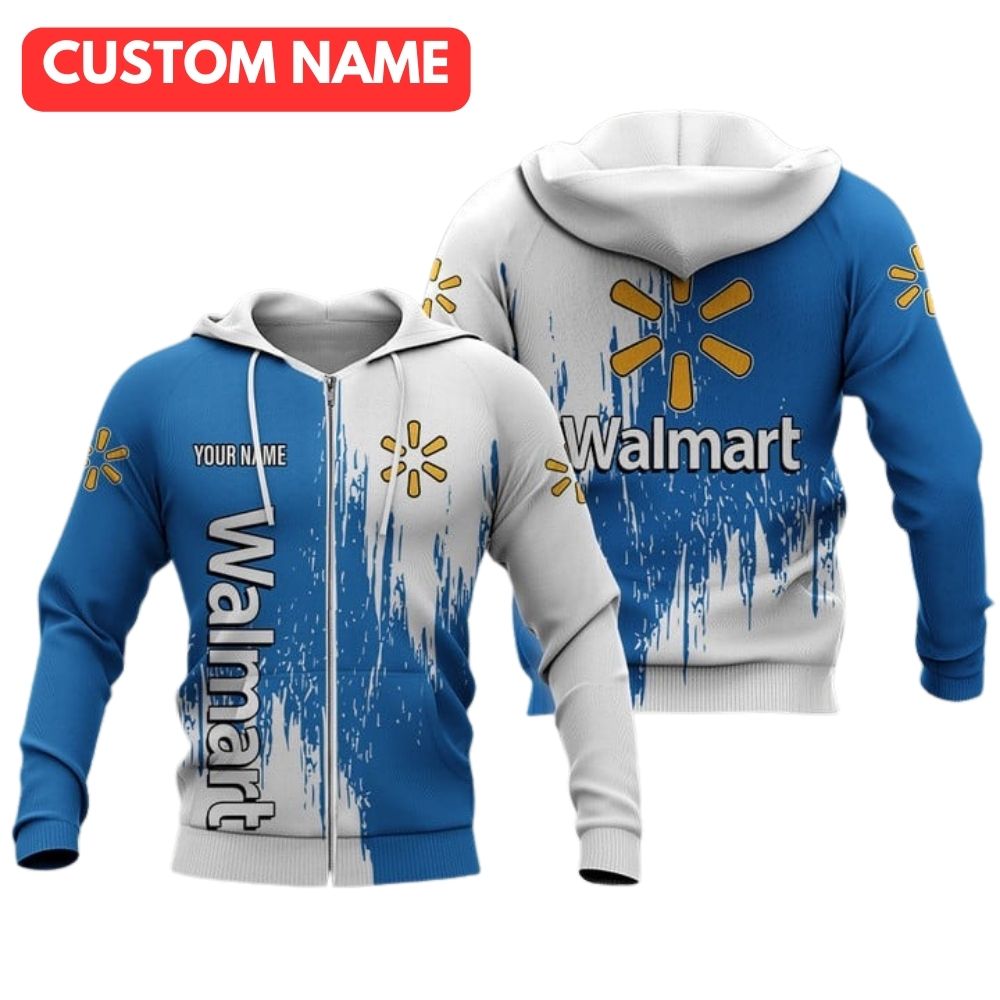 Show your love for Walmart with this personalized blue and white colorful all-over print hoodie featuring the iconic logo in your heart. Stay cozy and stylish while representing your favorite brand.
