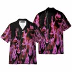 Stand out from the crowd with this unique Hawaiian shirt featuring pink flames and skulls in the dark. Perfect for adding a bold and edgy touch to your wardrobe.