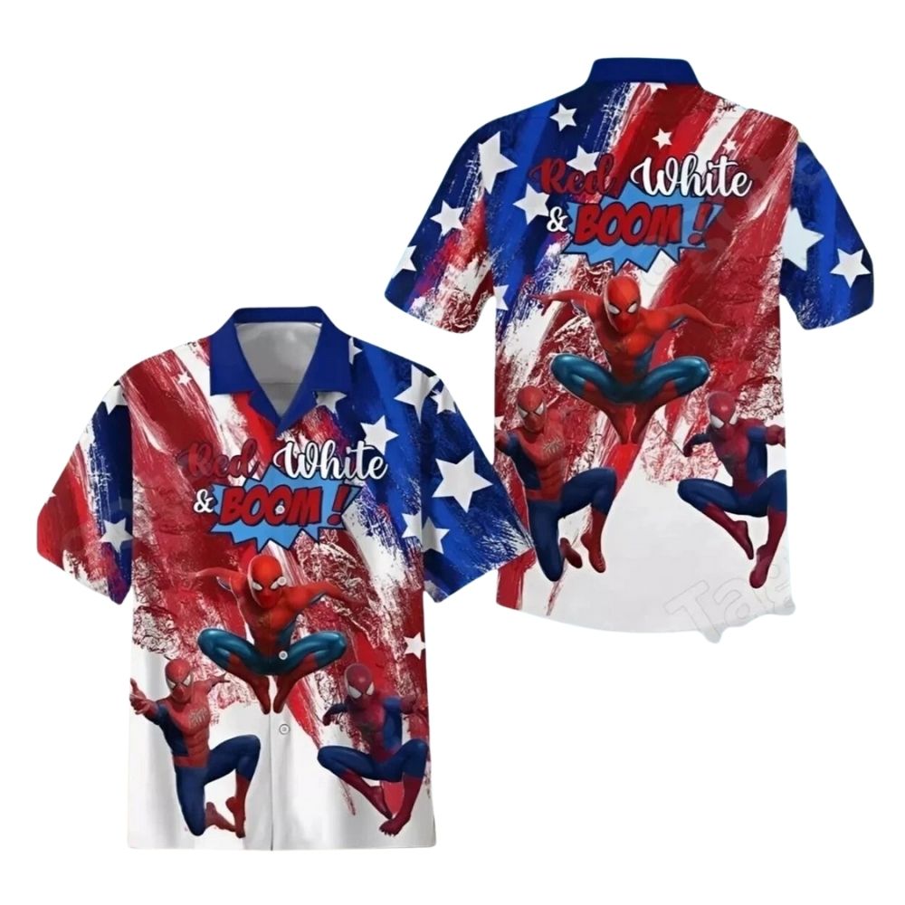 Celebrate the 4th of July in style with this Red White And Boom Spiderman With Flag American Hawaiian Shirt. Perfect for showing off your patriotic spirit at any Independence Day gathering.