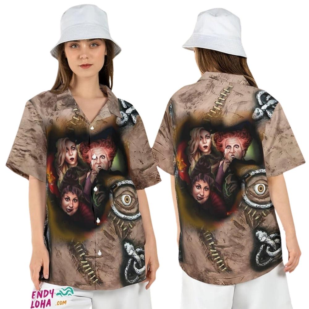 Get into the Halloween spirit with this Sanderson Sisters Hocus Pocus Spell Book Hawaiian Shirt. Perfect for adding a touch of spooky fun to your wardrobe.