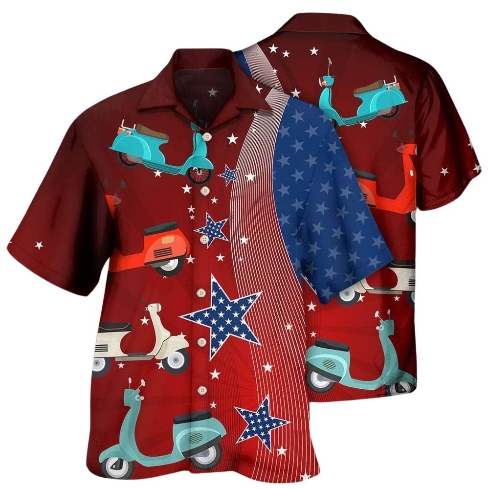 Celebrate Independence Day in style with this vibrant Hawaiian shirt featuring a scooter and USA star design. Perfect for adding a touch of fun to your summer wardrobe.