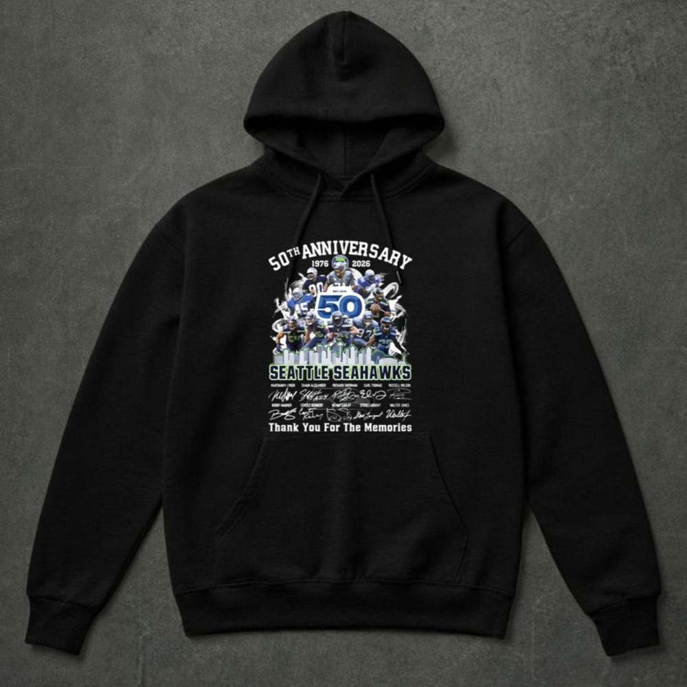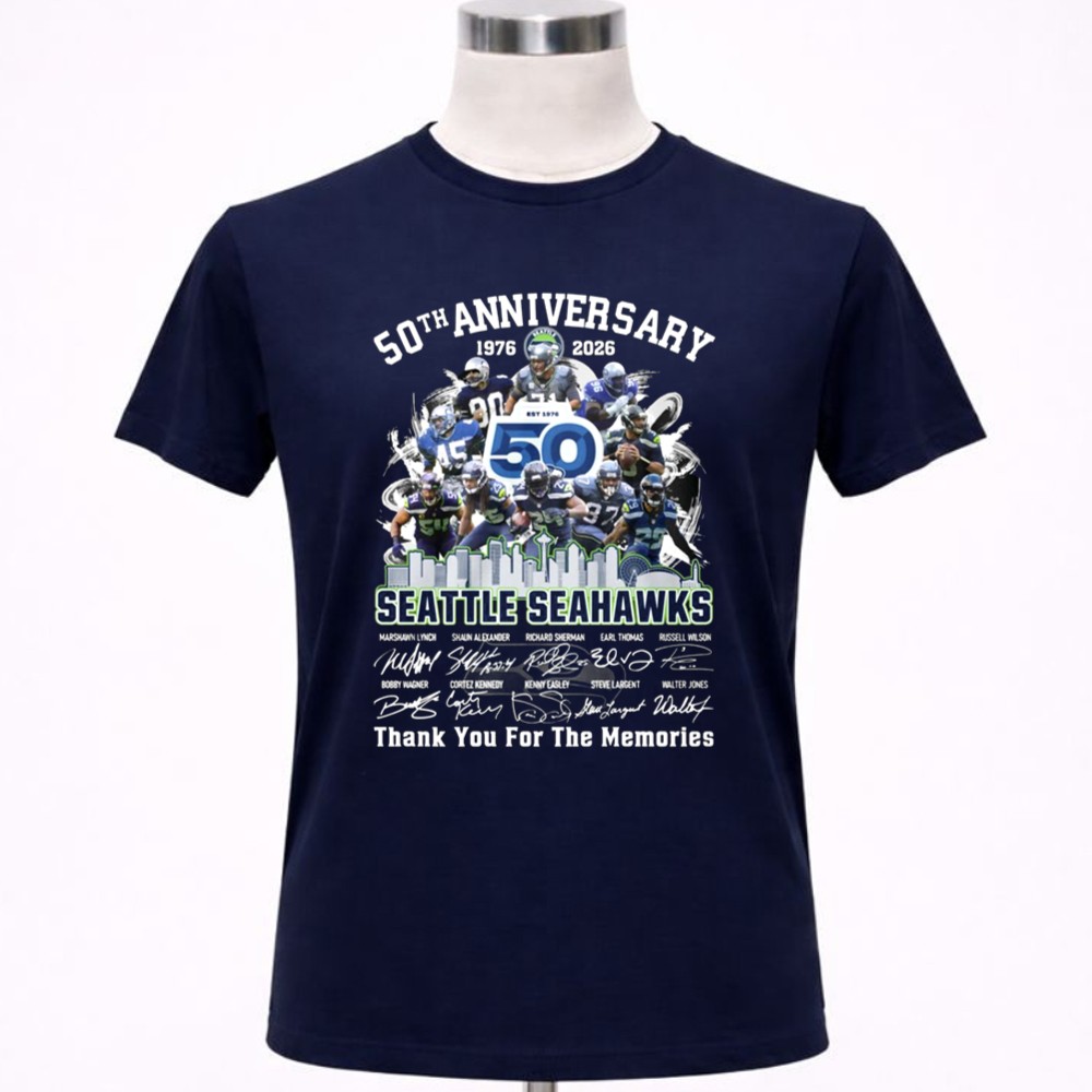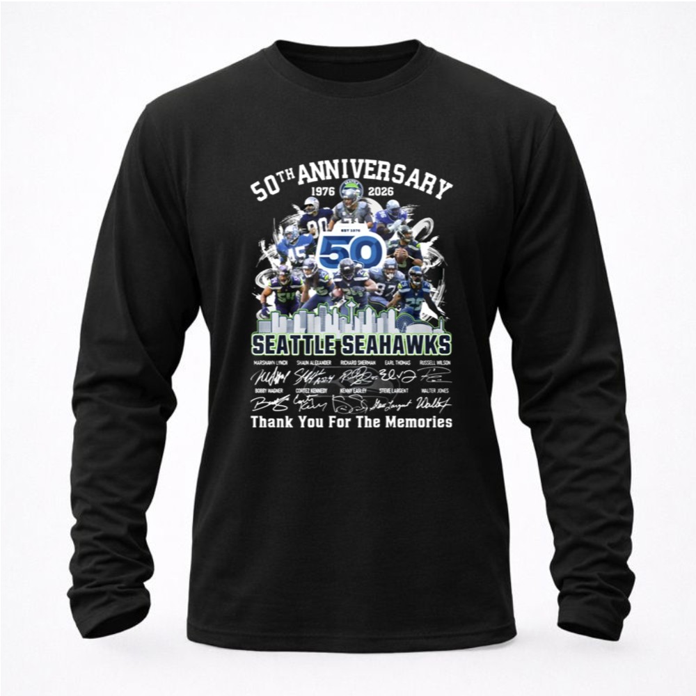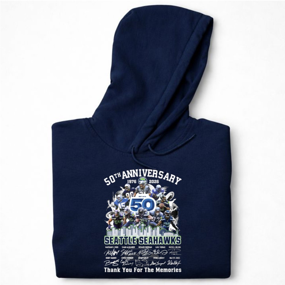 This design captures the essence of the Seattle Seahawks’ journey over 50 years, blending bold graphics with a heartfelt tribute to legends like Marshawn Lynch and Russell Wilson. It’s a wearable celebration of unforgettable moments and the city’s unwavering passion for football, evoking pride and nostalgia for lifelong fans.