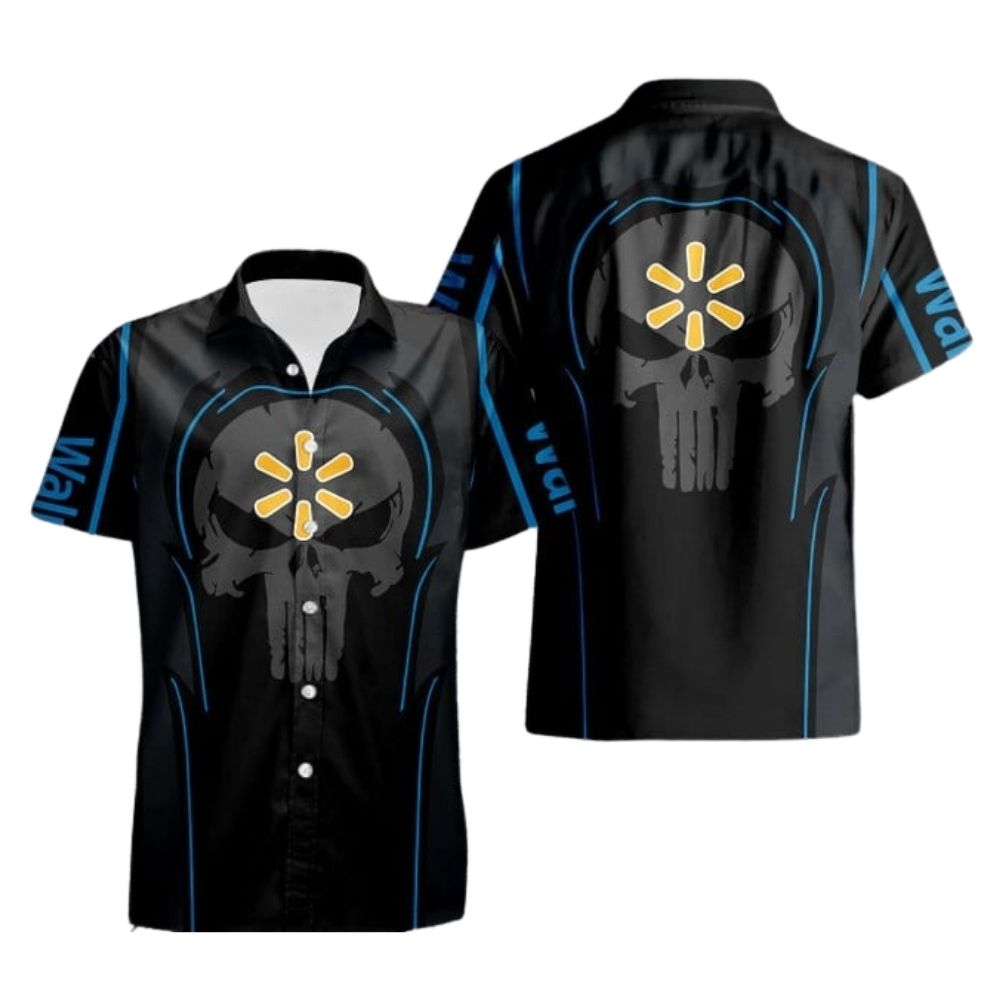 Add a touch of edgy style to your wardrobe with this Skull Punisher With Logo Walmart Black Hawaiian Shirt. Perfect for making a statement at any casual event or outing.