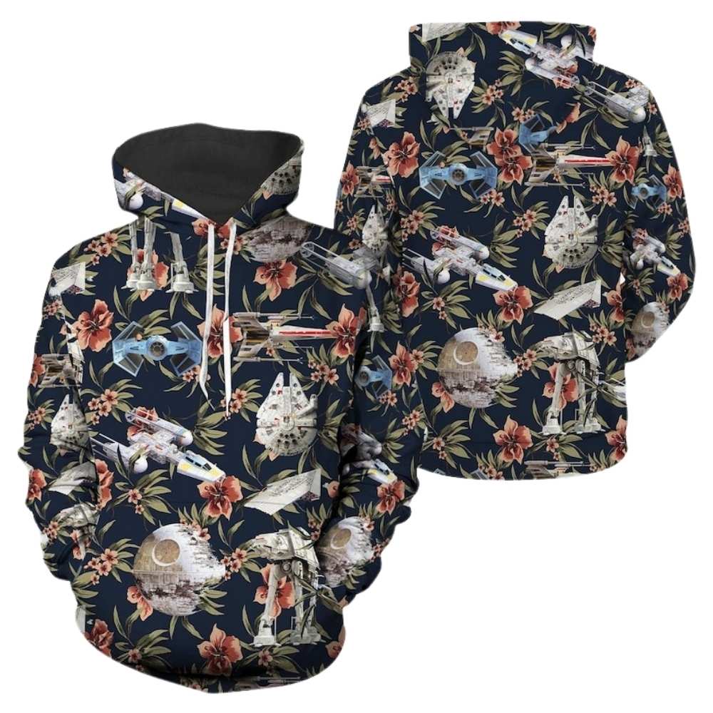 Show off your love for Star Wars with this unique Spaceship Floral All Over Print Hoodie. Perfect for any fan looking to add a touch of galactic style to their wardrobe.