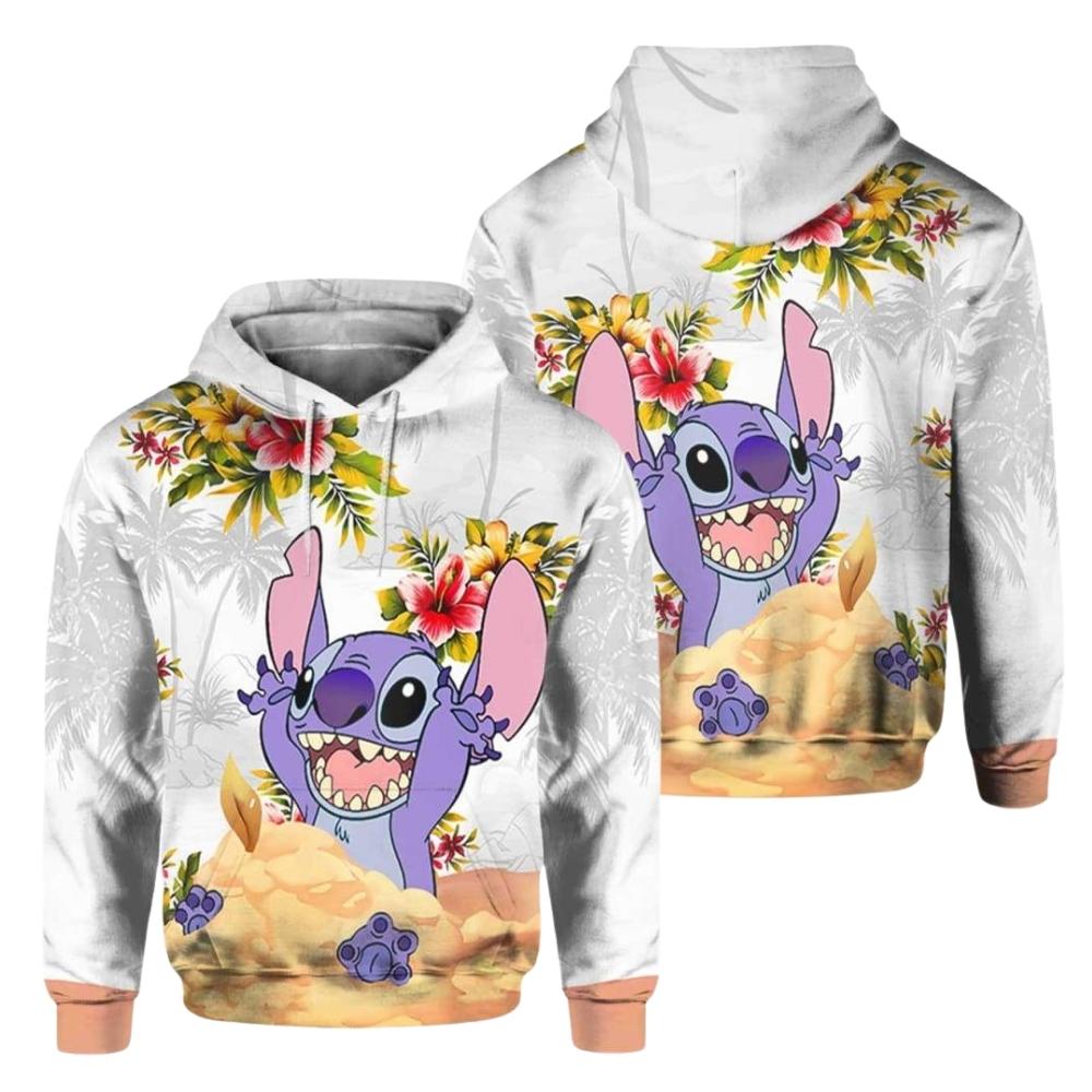 Elevate your beach style with the Stitch Aloha Play On Sand All Over Print Hoodie. Perfect for adding a touch of fun to your wardrobe.