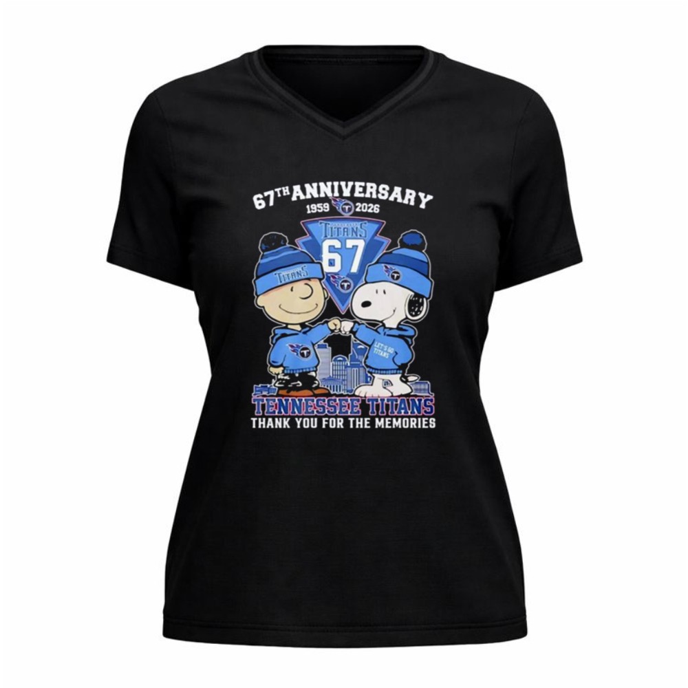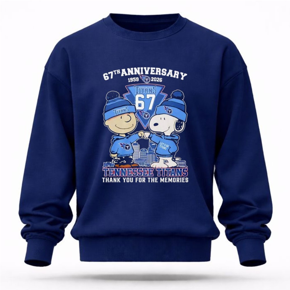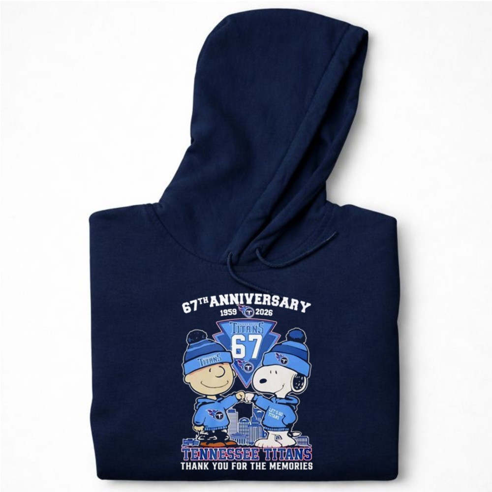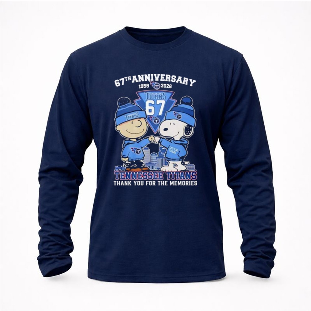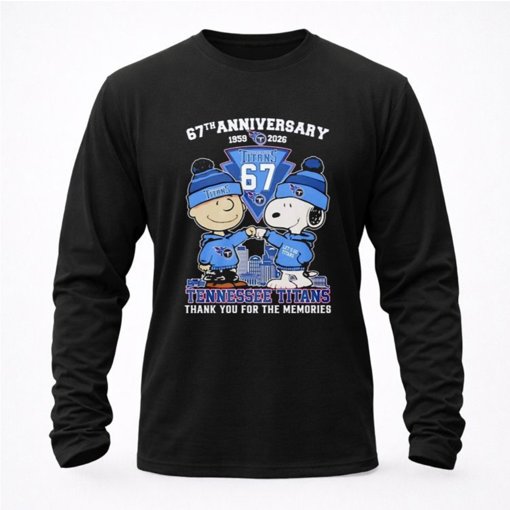 This design beautifully intertwines the legacy of the Tennessee Titans with the timeless charm of Snoopy and Charlie Brown. As they hold hands in Titans gear, the heartfelt message ‘THANK YOU FOR THE MEMORIES’ resonates with fans, evoking cherished moments from both the football field and childhood. The vibrant colors and playful cartoon style invite everyone to join in the celebration of this special anniversary.