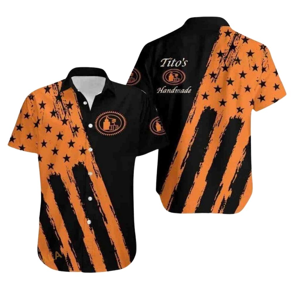 Show off your patriotic spirit with this Tito’s Handmade Vodka Flag American Hawaiian Shirt. Perfect for any occasion, this shirt is a must-have for those who love to stand out in style.