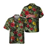 Add a touch of paradise to your wardrobe with this Budweiser Hawaiian shirt featuring a vibrant tropical flower and palm leaves design. Perfect for adding a pop of color and style to your summer outfits.
