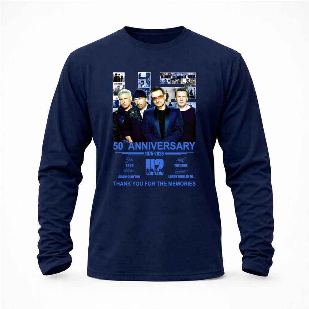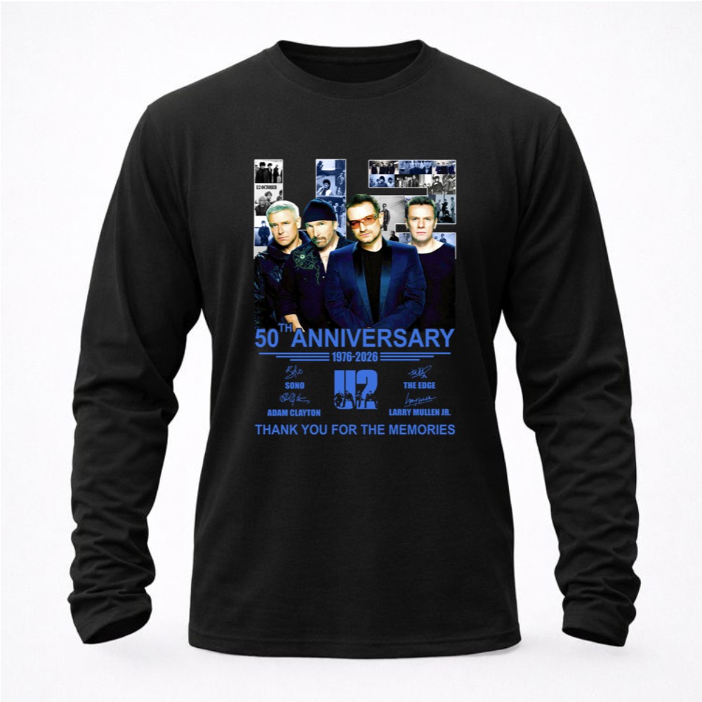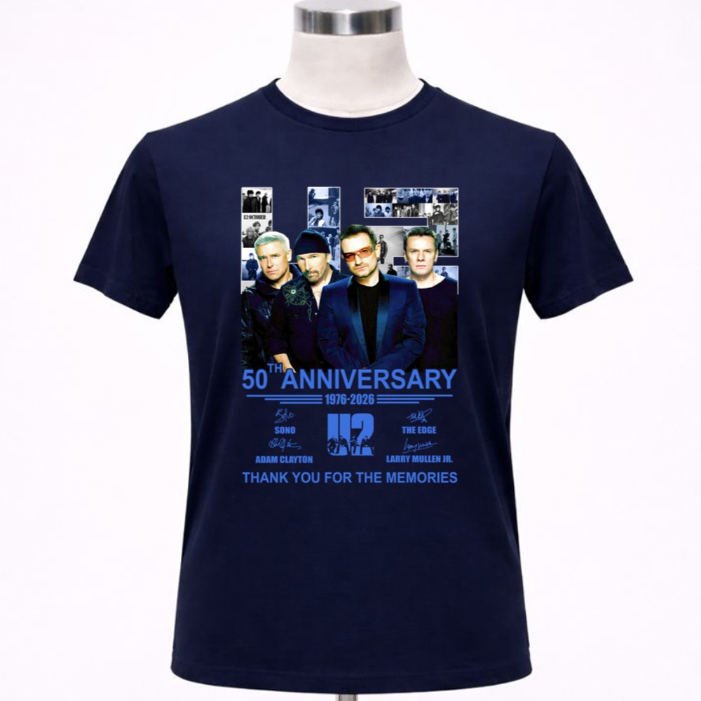 U2 band 50th anniversary, iconic rock legends, Bono, The Edge, Adam Clayton, Larry Mullen Jr., classic rock t-shirt, music history tribute, thank you for the memories shirt