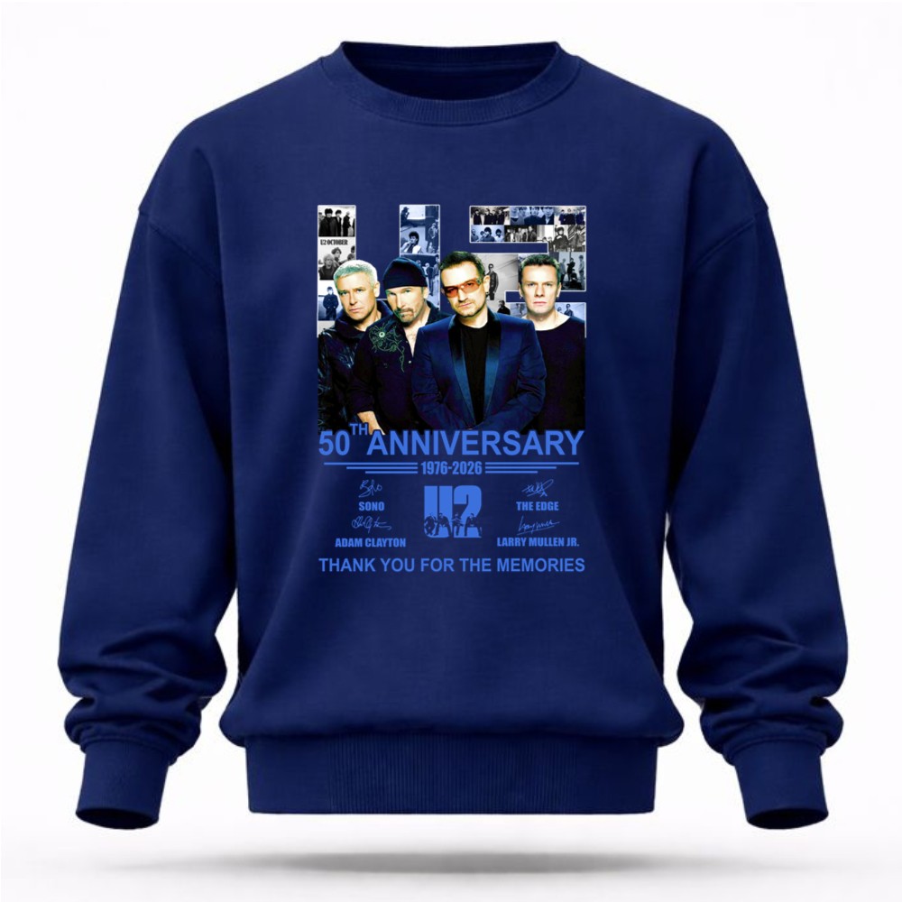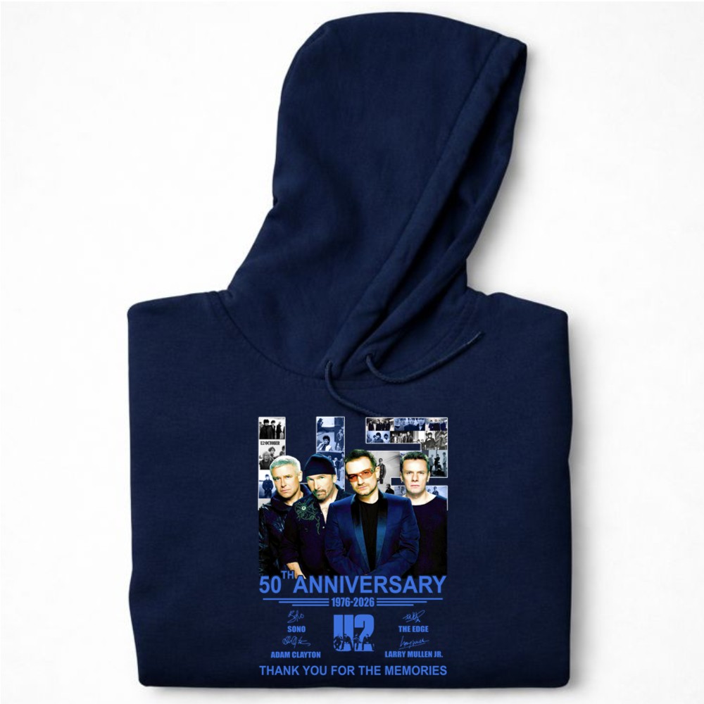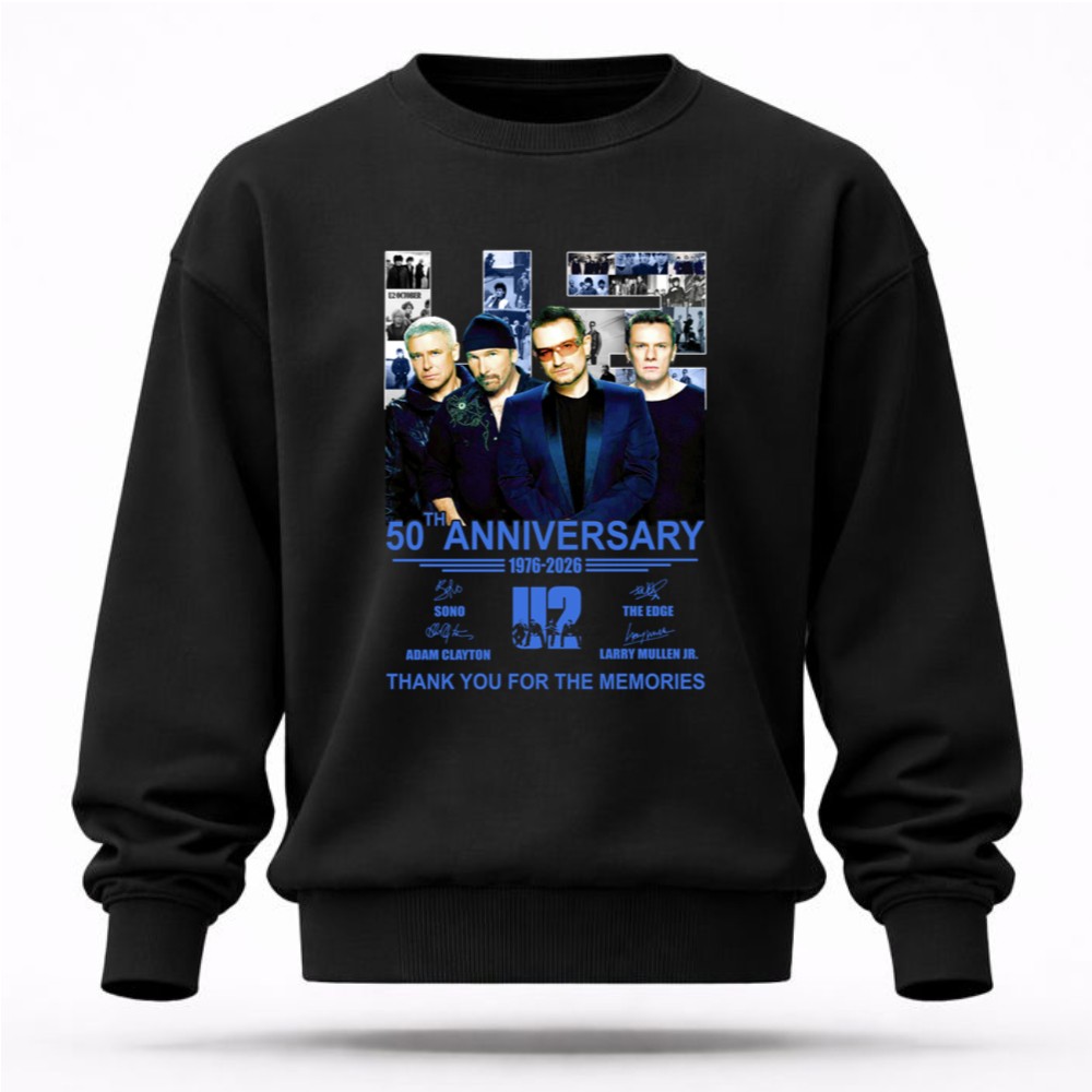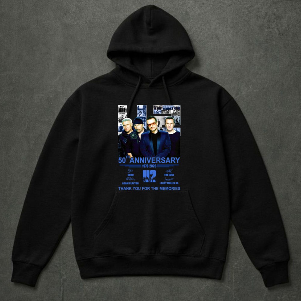 U2 band 50th anniversary, iconic rock legends, Bono, The Edge, Adam Clayton, Larry Mullen Jr., classic rock t-shirt, music history tribute, thank you for the memories shirt