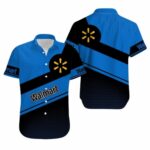 Show your love for Walmart with this stylish blue and black Hawaiian shirt featuring the iconic logo in a heart design. Perfect for casual outings or adding a touch of fun to your wardrobe.